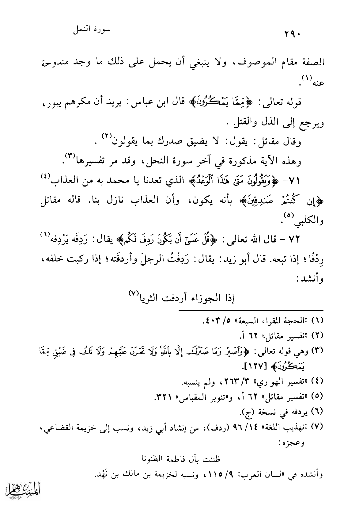(¬7) "تهذيب اللغة"14/ 96 (ردف)، من إنشاد أبي زيد، ونسب إلى خزيمة القضاعي، وعجزه: