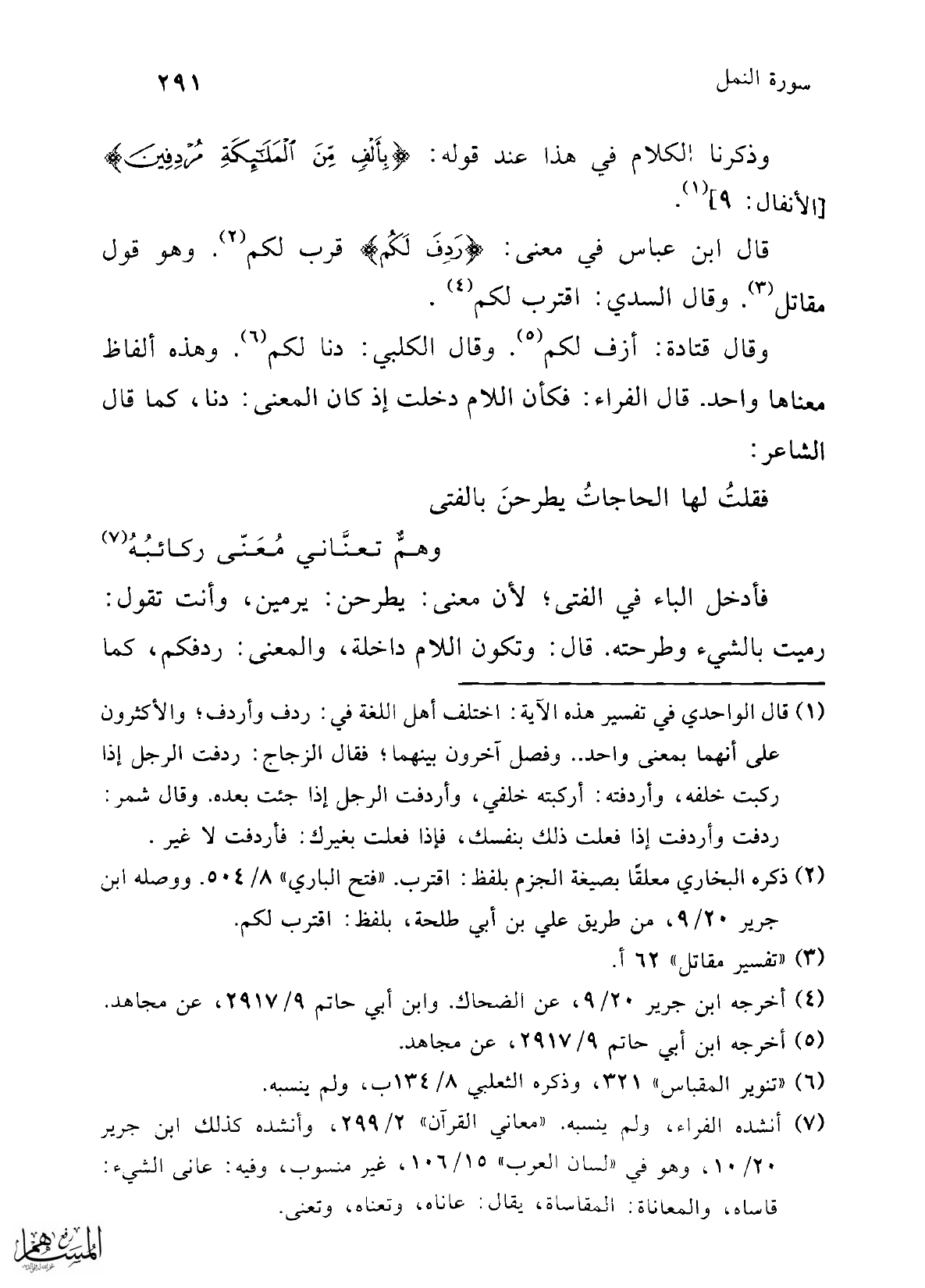 (¬1) قال الواحدي في تفسير هذه الآية: اختلف أهل اللغة في: ردف وأردف؛ والأكثرون على أنهما بمعنى واحد .. وفصل آخرون بينهما؛ فقال الزجاج: ردفت الرجل إذا ركبت خلفه، وأردفته: أركبته خلفي، وأردفت الرجل إذا جئت بعده. وقال شمر: ردفت وأردفت إذا فعلت ذلك بنفسك، فإذا فعلت بغيرك: فأردفت لا غير.