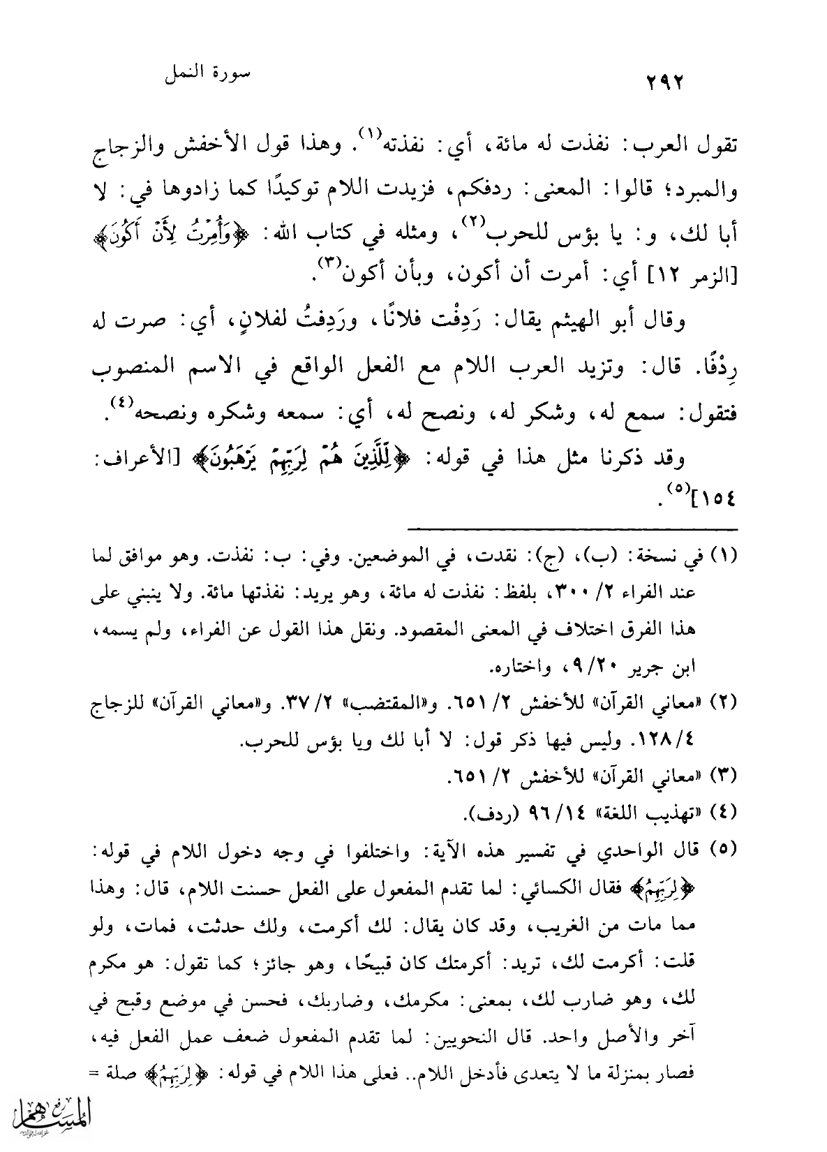 (¬5) قال الواحدي في تفسير هذه الآية: واختلفوا في وجه دخول اللام في قوله: {لِرَبِّهِمْ} فقال الكسائي: لما تقدم المفعول على الفعل حسنت اللام، قال: وهذا مما مات من الغريب، وقد كان يقال: لك أكرمت، ولك حدثت، فمات، ولو قلت: أكرمت لك، تريد: أكرمتك كان قبيحًا، وهو جائز؛ كما تقول: هو مكرم لك، وهو ضارب لك، بمعنى: مكرمك، وضاربك، فحسن في موضع وقبح في آخر والأصل واحد. قال النحويين: لما تقدم المفعول ضعف عمل الفعل فيه، فصار بمنزلة ما لا يتعدى فأدخل اللام .. فعلى هذا اللام في قوله: {لِرَبِّهِمْ} صلة =