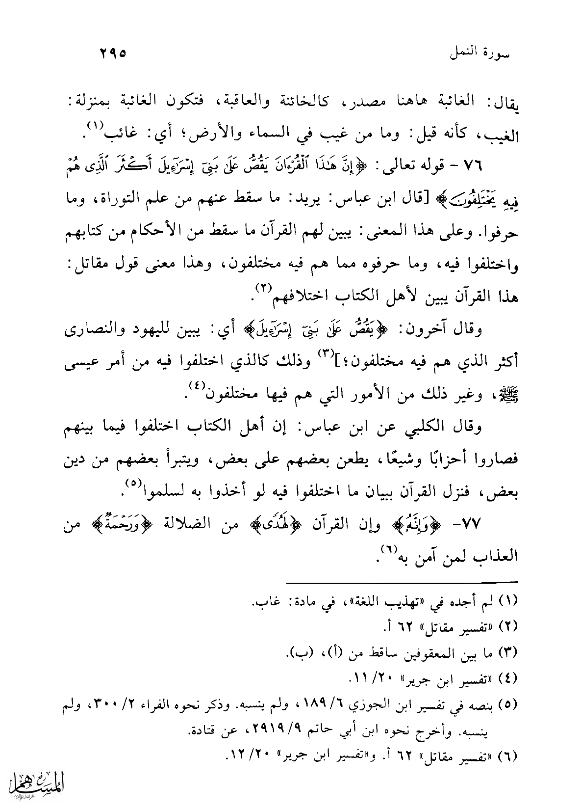 76 - قوله تعالى: {إِنَّ هَذَا الْقُرْآنَ يَقُصُّ عَلَى بَنِي إِسْرَائِيلَ أَكْثَرَ الَّذِي هُمْ فِيهِ يَخْتَلِفُونَ} [قال ابن عباس: يريد: ما سقط عنهم من علم التوراة، وما حرفوا. وعلى هذا المعنى: يبين لهم القرآن ما سقط من الأحكام من كتابهم واختلفوا فيه، وما حرفوه مما هم فيه مختلفون، وهذا معنى قول مقاتل: هذا القرآن يبين لأهل الكتاب اختلافهم (¬2).
