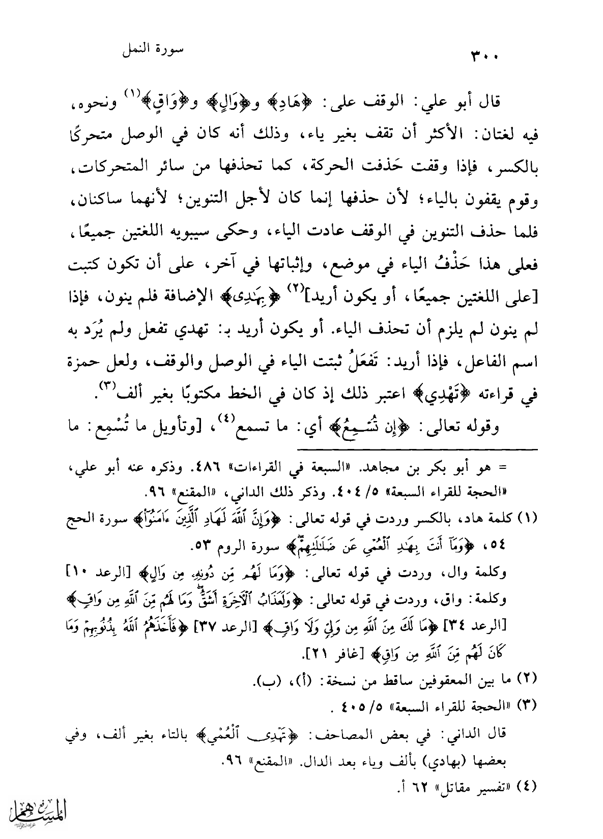 قال أبو علي: الوقف على: {هَادِ} و {وَالٍ} و {وَاقٍ} (¬1) ونحوه، فيه لغتان: الأكثر أن تقف بغير ياء، وذلك أنه كان في الوصل متحركًا بالكسر، فإذا وقفت حَذفت الحركة، كما تحذفها من سائر المتحركات، وقوم يقفون بالياء؛ لأن حذفها إنما كان لأجل التنوين؛ لأنهما ساكنان، فلما حذف التنوين في الوقف عادت الياء، وحكى سيبويه اللغتين جميعًا، فعلى هذا حَذْفُ الياء في موضع، وإثباتها في آخر، على أن تكون كتبت [على اللغتين جميعًا، أو يكون أريد] (¬2) {بِهَادِي} الإضافة فلم ينون، فإذا لم ينون لم يلزم أن تحذف الياء. أو يكون أريد بـ: تهدي تفعل ولم يُرَد به اسم الفاعل، فإذا أريد: تَفعَلُ ثبتت الياء في الوصل والوقف، ولعل حمزة في قراءته {تَهْدِي} اعتبر ذلك إذ كان في الخط مكتوبًا بغير ألف (¬3).