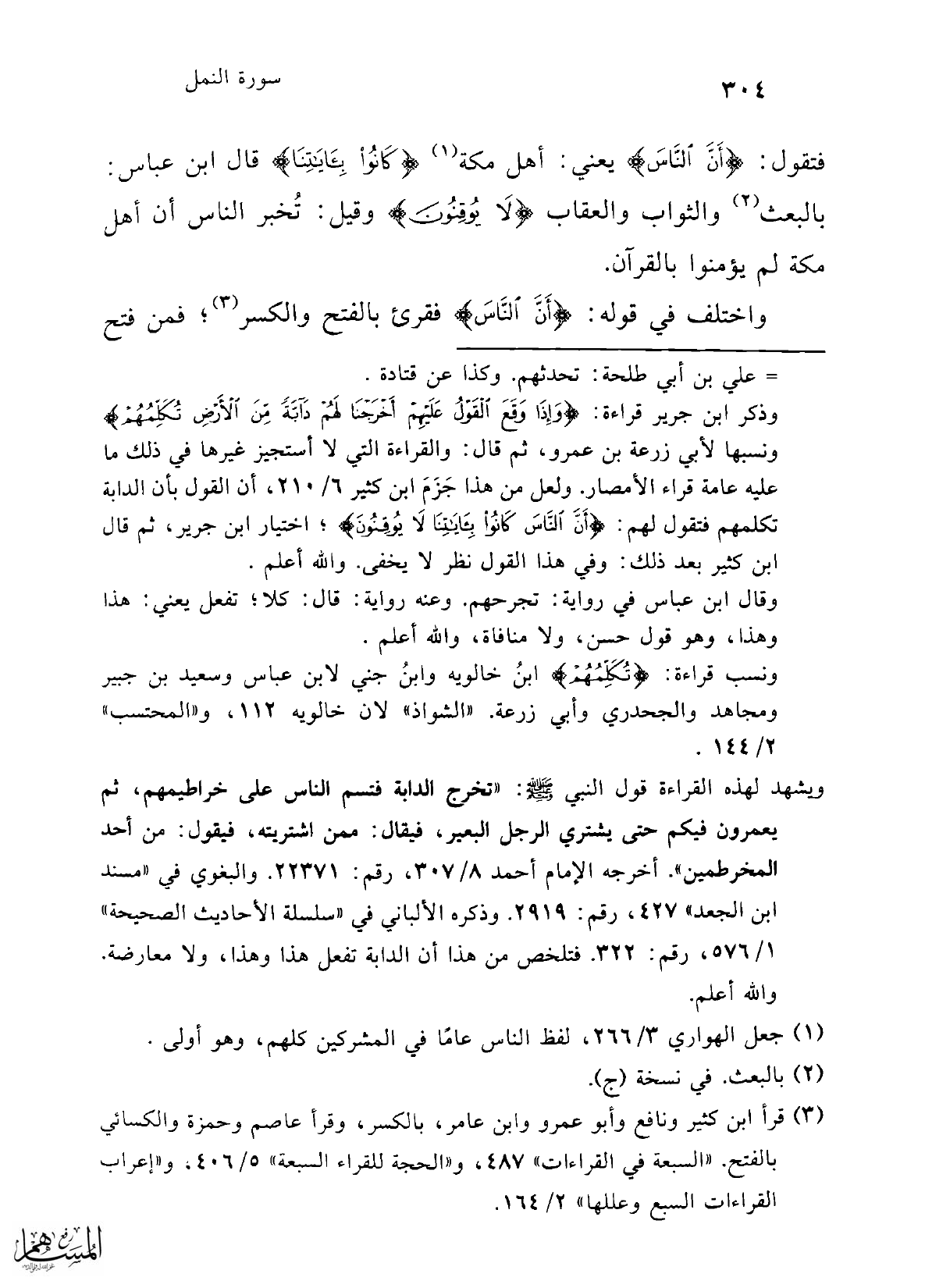 وذكر ابن جرير قراءة: {وَإِذَا وَقَعَ الْقَوْلُ عَلَيْهِمْ أَخْرَجْنَا لَهُمْ دَابَّةً مِنَ الْأَرْضِ تُكَلِّمُهُمْ} ونسبها لأبي زرعة بن عمرو، ثم قال: والقراءة التي لا أستجيز غيرها في ذلك ما عليه عامة قراء الأمصار. ولعل من هذا جَزَمَ ابن كثير 6/ 210، أن القول بأن الدابة تكلمهم فتقول لهم: {أَنَّ النَّاسَ كَانُوا بِآيَاتِنَا لَا يُوقِنُونَ}؛ اختيار ابن جرير، ثم قال ابن كثير بعد ذلك: وفي هذا القول نظر لا يخفى. والله أعلم.