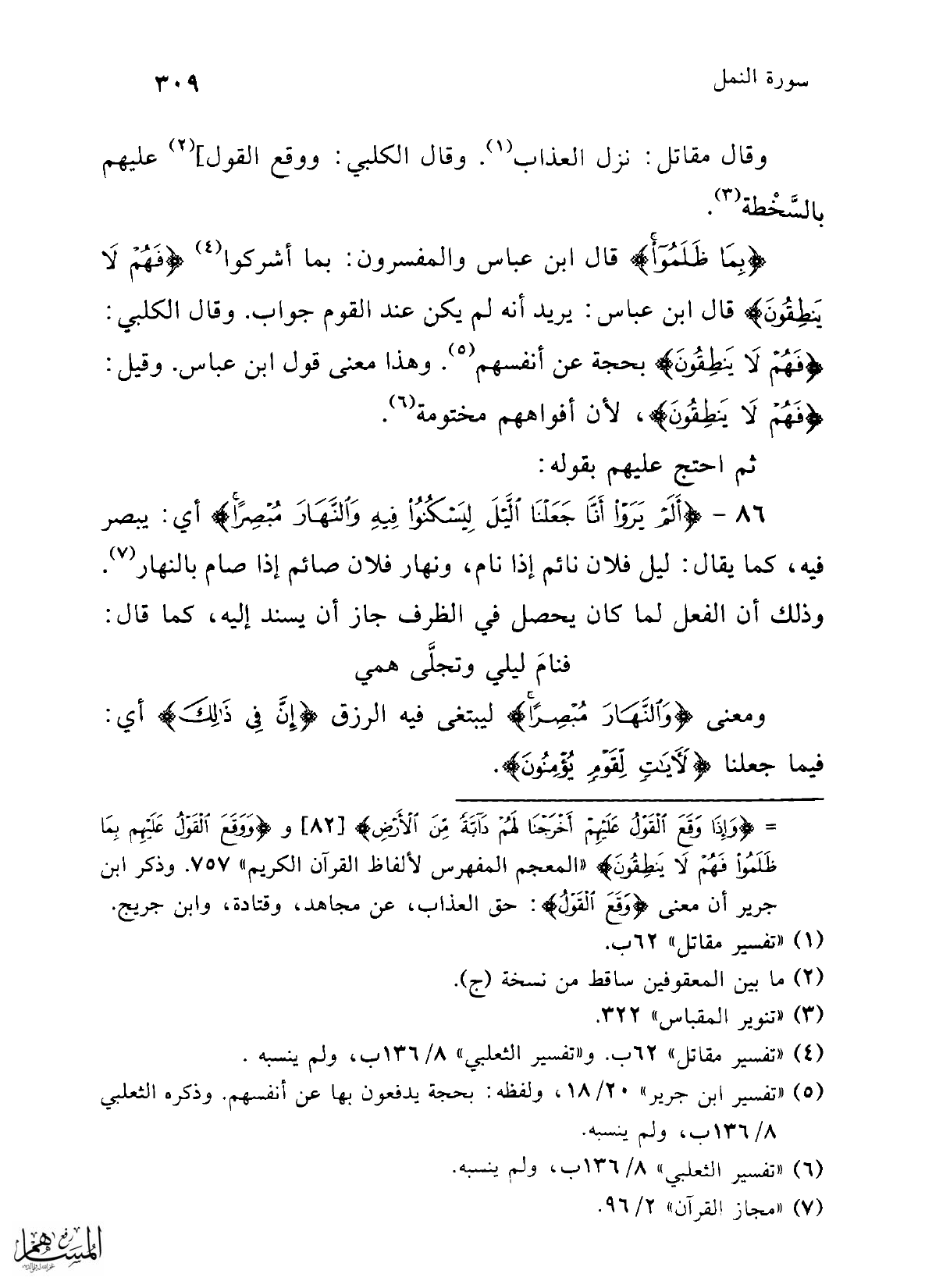 86 - {أَلَمْ يَرَوْا أَنَّا جَعَلْنَا اللَّيْلَ لِيَسْكُنُوا فِيهِ وَالنَّهَارَ مُبْصِرًا} أي: يبصر فيه، كما يقال: ليل فلان نائم إذا نام، ونهار فلان صائم إذا صام بالنهار (¬7). وذلك أن الفعل لما كان يحصل في الظرف جاز أن يسند إليه، كما قال: