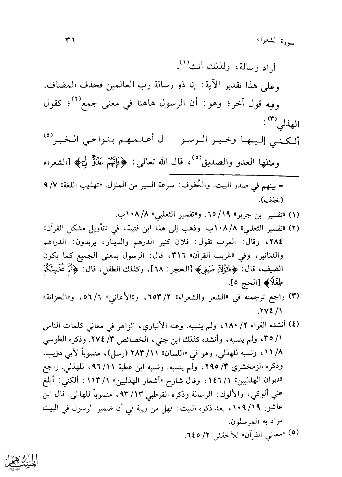 (¬2) "تفسير الثعلبي" 8/ 108 ب. وذهب إلى هذا ابن قتيبة، في "تأويل مشكل القرآن" 284، وقال: العرب تقول: فلان كثير الدرهم والدينار، يريدون: الدراهم والدنانير، وفي "غريب القرآن" 316، قال: الرسول بمعنى الجميع كما يكون الضيف، قال: {هَؤُلَاءِ ضَيْفِي} [الحجر: 68]، وكذلك الطفل، قال: {ثُمَّ نُخْرِجُكُمْ طِفْلًا} [الحج: 5].