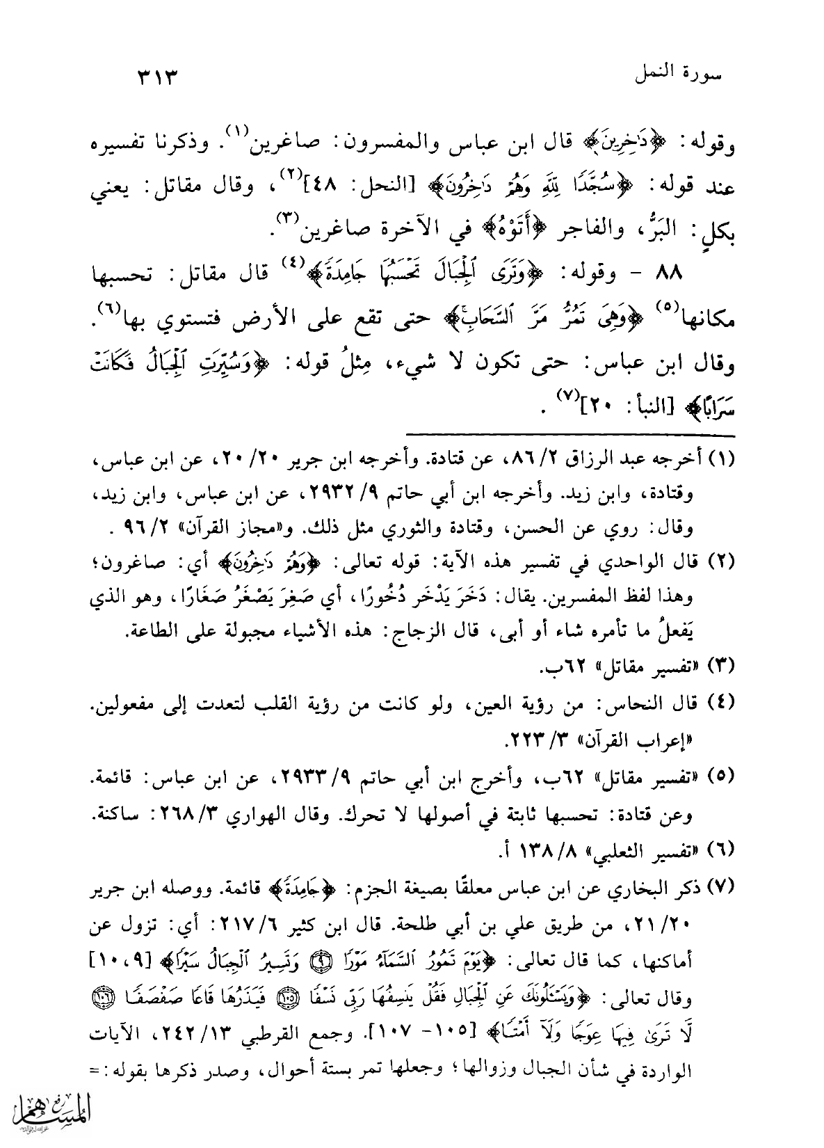 (¬7) ذكر البخاري عن ابن عباس معلقًا بصيغة الجزم: {جَامِدَةً} قائمة. ووصله ابن جرير 20/ 21، من طريق علي بن أبي طلحة. قال ابن كثير 6/ 217: أىِ: تزول عن أماكنها، كما قال تعالى: {يَوْمَ تَمُورُ السَّمَاءُ مَوْرًا (9) وَتَسِيرُ الْجِبَالُ سَيْرًا} [9، 10] وقال تعالى: {وَيَسْأَلُونَكَ عَنِ الْجِبَالِ فَقُلْ يَنْسِفُهَا رَبِّي نَسْفًا (105) فَيَذَرُهَا قَاعًا صَفْصَفًا (106) لَا تَرَى فِيهَا عِوَجًا وَلَا أَمْتًا} [105 - 107]. وجمع القرطبي 13/ 242، الآيات الواردة في شأن الجبال وزوالها؛ وجعلها تمر بستة أحوال، وصدر ذكرها بقوله: =