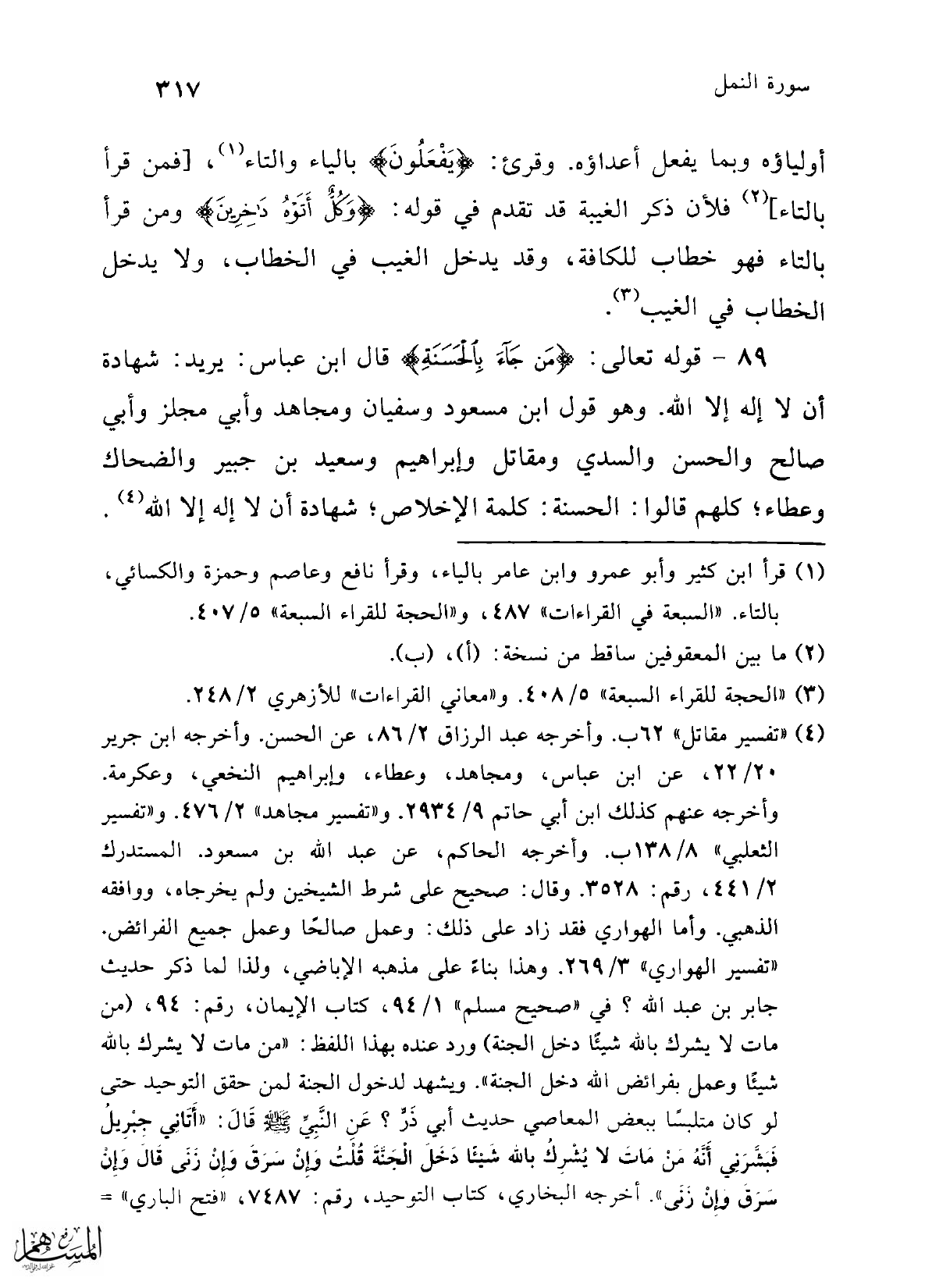 (¬4) "تفسير مقاتل" 62 ب. وأخرجه عبد الرزاق 2/ 86، عن الحسن. وأخرجه ابن جرير 20/ 22، عن ابن عباس، ومجاهد، وعطاء، وإبراهيم النخعي، وعكرمة. وأخرجه عنهم كذلك ابن أبي حاتم 9/ 2934. و"تفسير مجاهد" 2/ 476. و"تفسير الثعلبي" 8/ 138 ب. وأخرجه الحاكم، عن عبد الله بن مسعود. المستدرك 2/ 441، رقم: 3528. وقال: صحيح على شرط الشيخين ولم يخرجاه، ووافقه الذهبي. وأما الهواري فقد زاد على ذلك: وعمل صالحًا وعمل جميع الفرائض. "تفسير الهواري" 3/ 269. وهذا بناءً على مذهبه الإباضي، ولذا لما ذكر حديث جابر بن عبد الله؟ في "صحيح مسلم" 1/ 94، كتاب الإيمان، رقم: 94، (من مات لا يشرك بالله شيئًا دخل الجنة) ورد عنده بهذا اللفظ: "من مات لا يشرك بالله شيئًا وعمل بفرائض الله دخل الجنة". ويشهد لدخول الجنة لمن حقق التوحيد حتى لو كان متلبسًا ببعض المعاصي حديث أبي ذَرَّ؟ عَن النَّبِيِّ -صلى الله عليه وسلم- قَالَ: "أَتَانِي جبْرِيلُ فَبَشَّرَنِي أَنَّهُ مَنْ مَاتَ لا يُشْرك باللهِ شَيْئًا دَخَلَ الْجَنَّةَ قُلْتُ وإنْ سَرَقَ وَإِنْ زَنَى قَالَ وَإِنْ سَرَقَ وإنْ زَنَى". أخرجه البخاري، كتاب التوحيد، رقم: 7487، "فتح الباري" =