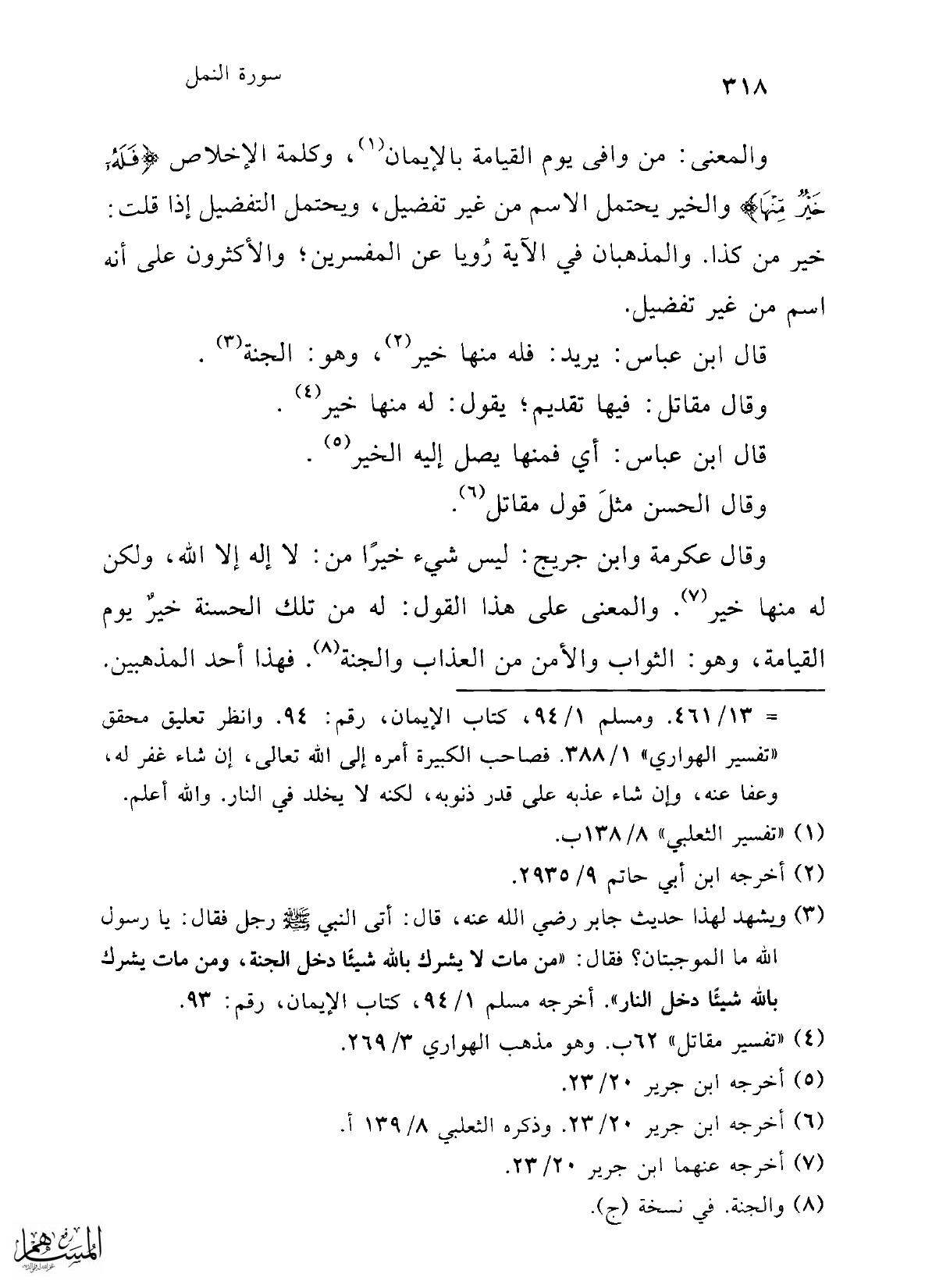 والمعنى: من وافى يوم القيامة بالإيمان (¬1)، وكلمة الإخلاص {فَلَهُ خَيْرٌ مِنْهَا} والخير يحتمل الاسم من غير تفضيل، ويحتمل التفضيل إذا قلت: خير من كذا. والمذهبان في الآية رُويا عن المفسرين؛ والأكثرون على أنه اسم من غير تفضيل.