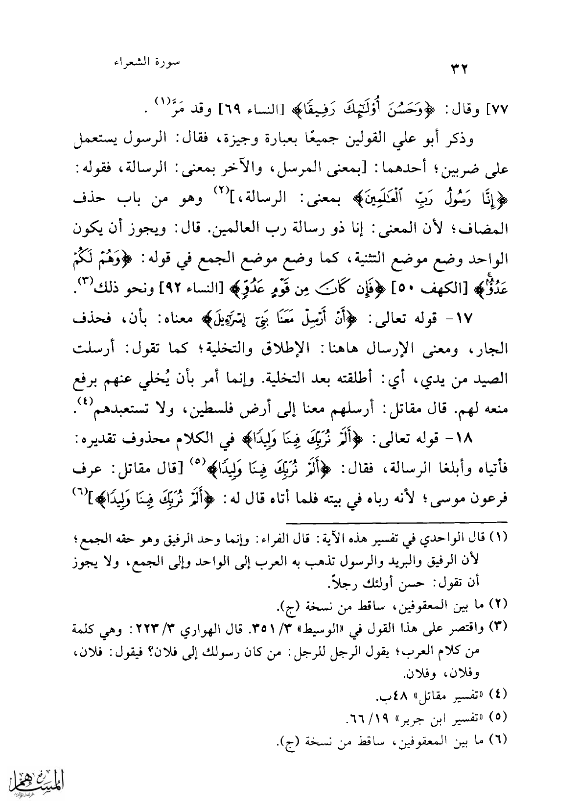 وذكر أبو علي القولين جميعًا بعبارة وجيزة، فقال: الرسول يستعمل على ضربين؛ أحدهما: [بمعنى المرسل، والآخر بمعنى: الرسالة، فقوله: {إِنَّا رَسُولُ رَبِّ الْعَالَمِينَ} بمعنى: الرسالة،] (¬2) وهو من باب حذف المضاف؛ لأن المعنى: إنا ذو رسالة رب العالمين. قال: ويجوز أن يكون الواحد وضع موضع التثنية، كما وضع موضع الجمع في قوله: {وَهُمْ لَكُمْ عَدُوٌّ} [الكهف: 50]، {فَإِنْ كَانَ مِنْ قَوْمٍ عَدُوٍّ} [النساء: 92]، ونحو ذلك (¬3).
