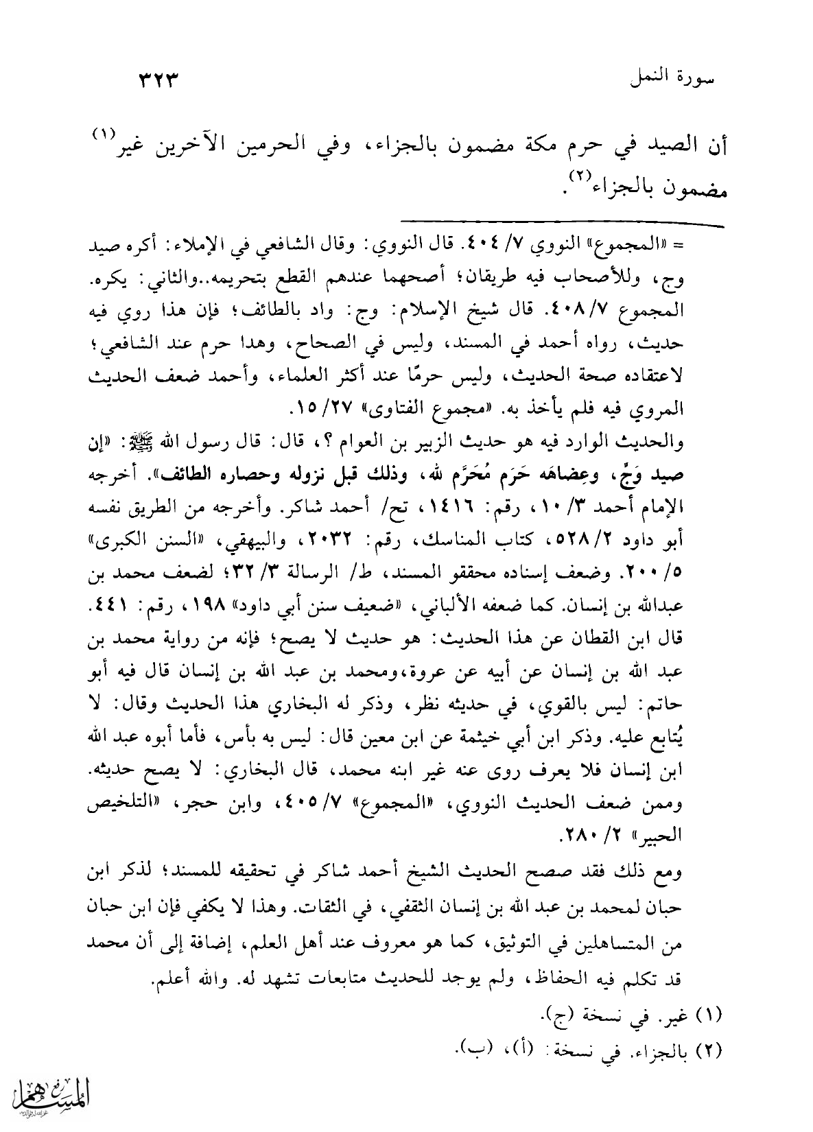= "المجموع" النووي 7/ 404. قال النووي: وقال الشافعي في الإملاء: أكره صيد وج، وللأصحاب فيه طريقان؛ أصحهما عندهم القطع بتحريمه .. والثاني: يكره. المجموع 7/ 408. قال شيخ الإسلام: وج: واد بالطائف؛ فإن هذا روي فيه حديث، رواه أحمد في المسند، وليس في الصحاح، وهذا حرم عند الشافعي؛ لاعتقاده صحة الحديث، وليس حرما عند أكثر العلماء، وأحمد ضعف الحديث المروي فيه فلم يأخذ به "مجموع الفتاوى" 27/ 15.