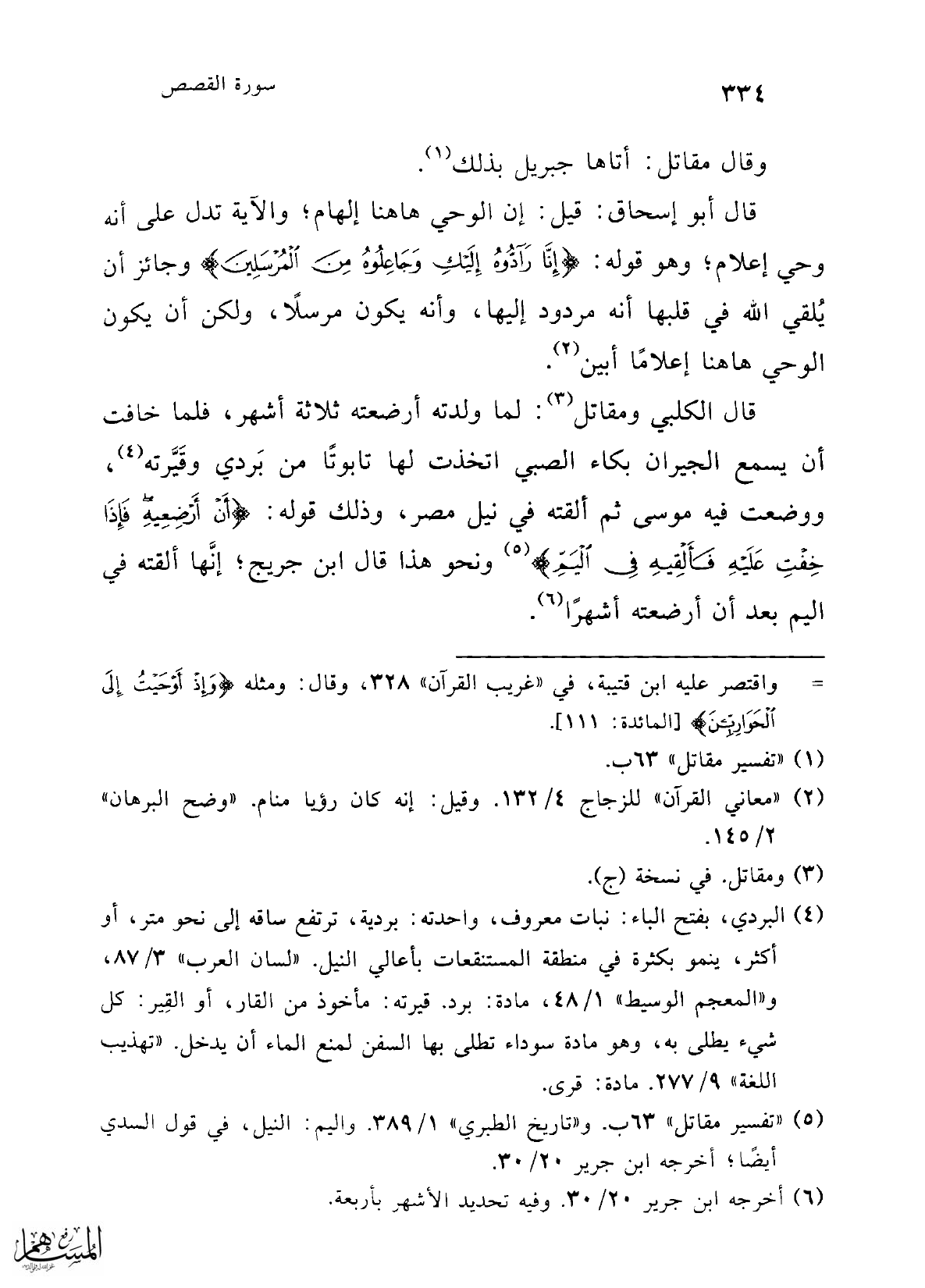 (¬5) "تفسير مقاتل" 63 ب. و"تاريخ الطبري" 1/ 389. واليم: النيل، في قول السدي أيضًا؛ أخرجه ابن جرير 20/ 30.