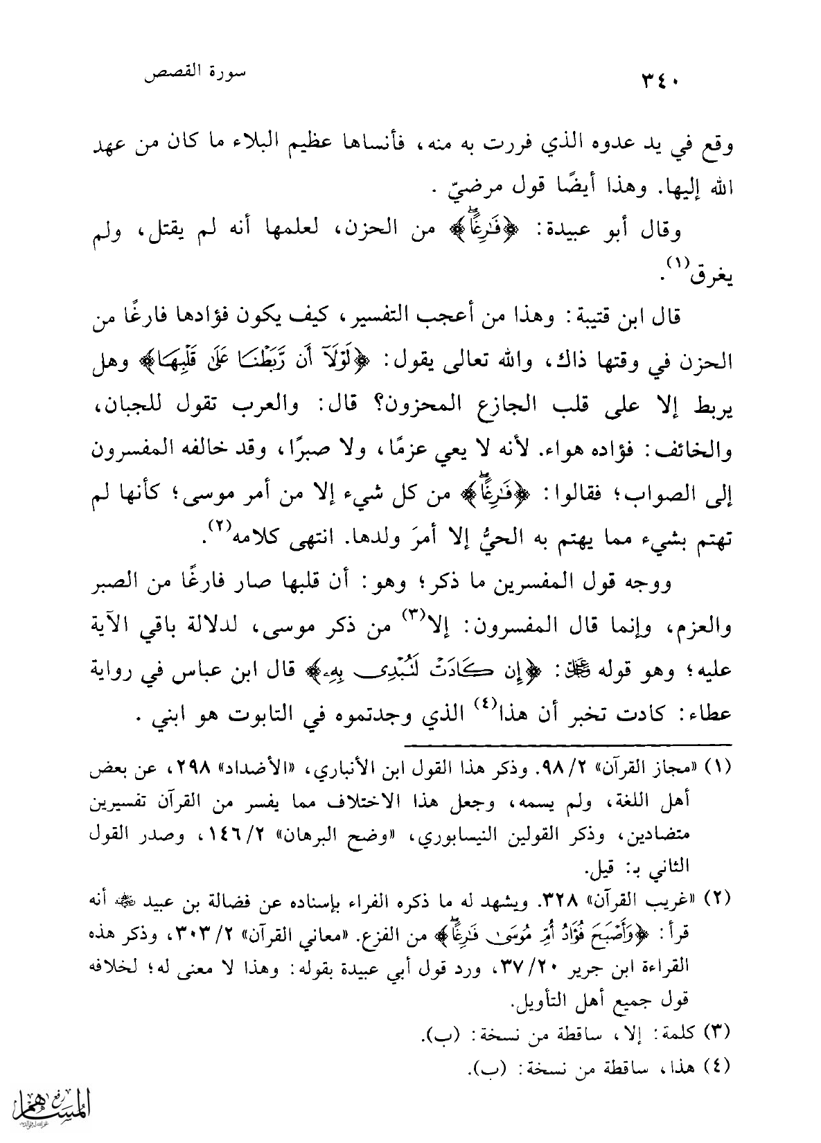 قال ابن قتيبة: وهذا من أعجب التفسير، كيف يكون فؤادها فارغًا من الحزن في وقتها ذاك، والله تعالى يقول: {لَوْلَا أَنْ رَبَطْنَا عَلَى قَلْبِهَا} وهل يربط إلا على قلب الجازع المحزون؟ قال: والعرب تقول للجبان، والخائف: فؤاده هواء. لأنه لا يعي عزمًا, ولا صبرًا، وقد خالفه المفسرون إلى الصواب؛ فقالوا: {فَارِغًا} من كل شيء إلا من أمر موسى؛ كأنها لم تهتم بشيء مما يهتم به الحيُّ إلا أمرَ ولدها. انتهى كلامه (¬2).
