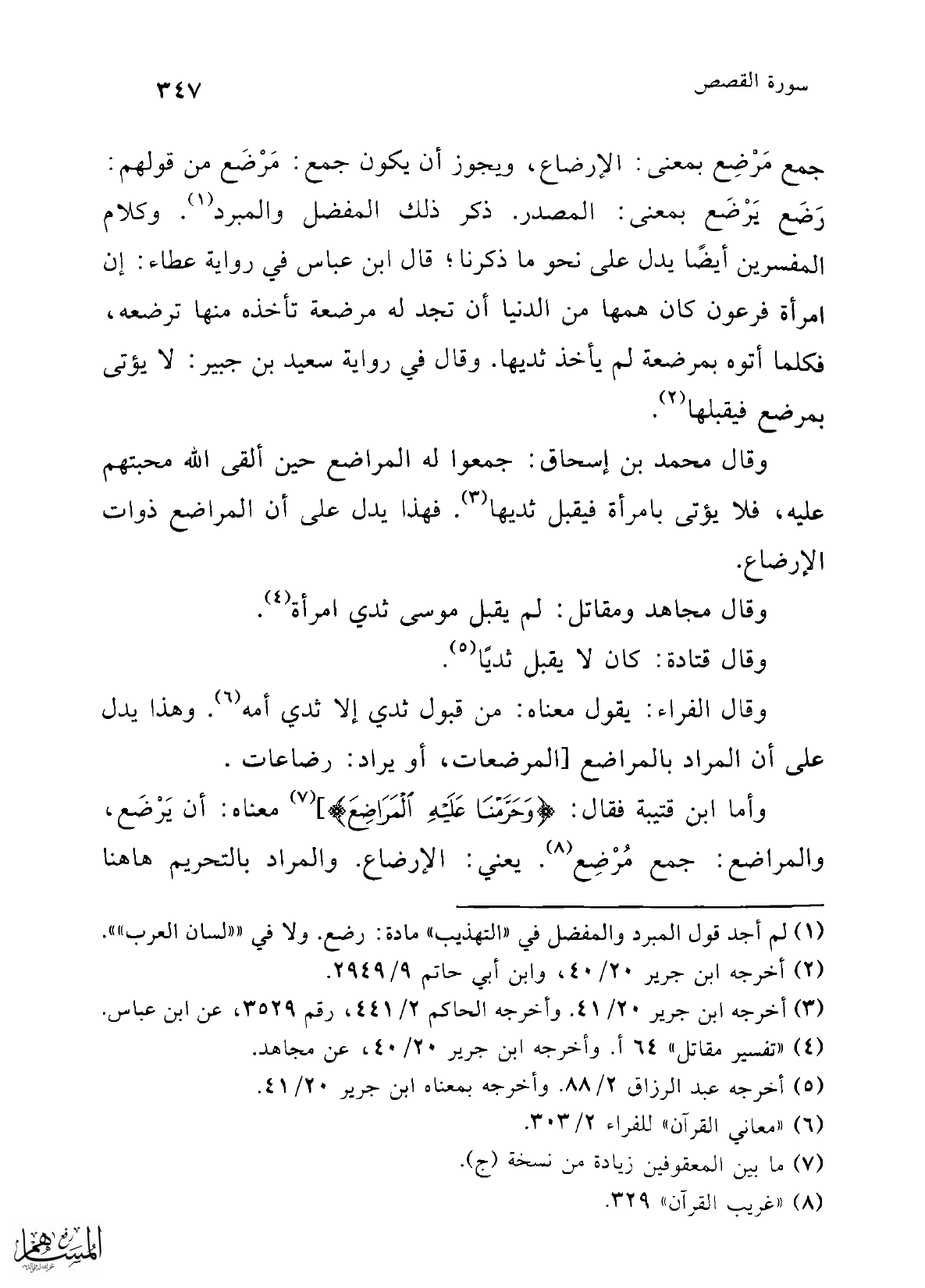 جمع مَرْضِع منى: الإرضاع، ويجوز أن يكون جمع: مَرْضَع من قولهم: رَضَع يَرْضَع بمعنى: المصدر. ذكر ذلك المفضل والمبرد (¬1). وكلام المفسرين أيضًا يدل على نحو ما ذكرنا؛ قال ابن عباس في رواية عطاء: إن امرأة فرعون كان همها من الدنيا أن تجد له مرضعة تأخذه منها ترضعه، فكلما أتوه بمرضعة لم يأخذ ثديها. وقال في رواية سعيد بن جبير: لا يؤتى بمرضع فيقبلها (¬2).
