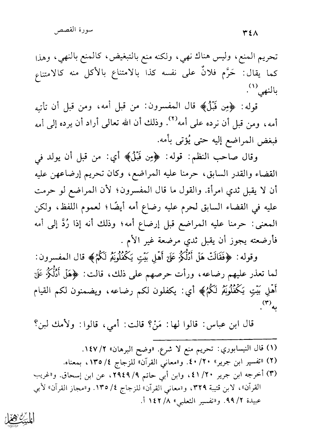 وقال صاحب النظم: قوله: {مِنْ قَبْلُ} أي: من قبل أن يولد في القضاء والقدر السابق، حرمنا عليه المراضع، وكان تحريم إرضاعهن عليه أن لا يقبل ثدي امرأة. والقول ما قال المفسرون؛ لأن المراضع لو حرمت عليه في القضاء السابق لحرم عليه رضاع أمه أيضًا؛ لعموم اللفظ، ولكن المعنى: حرمنا عليه المراضع قبل إرضاع أمه؛ وذلك أنه إذا رُدَّ إلى أمه فأرضعته يجوز أن يقبل ثدي مرضعة غير الأم.