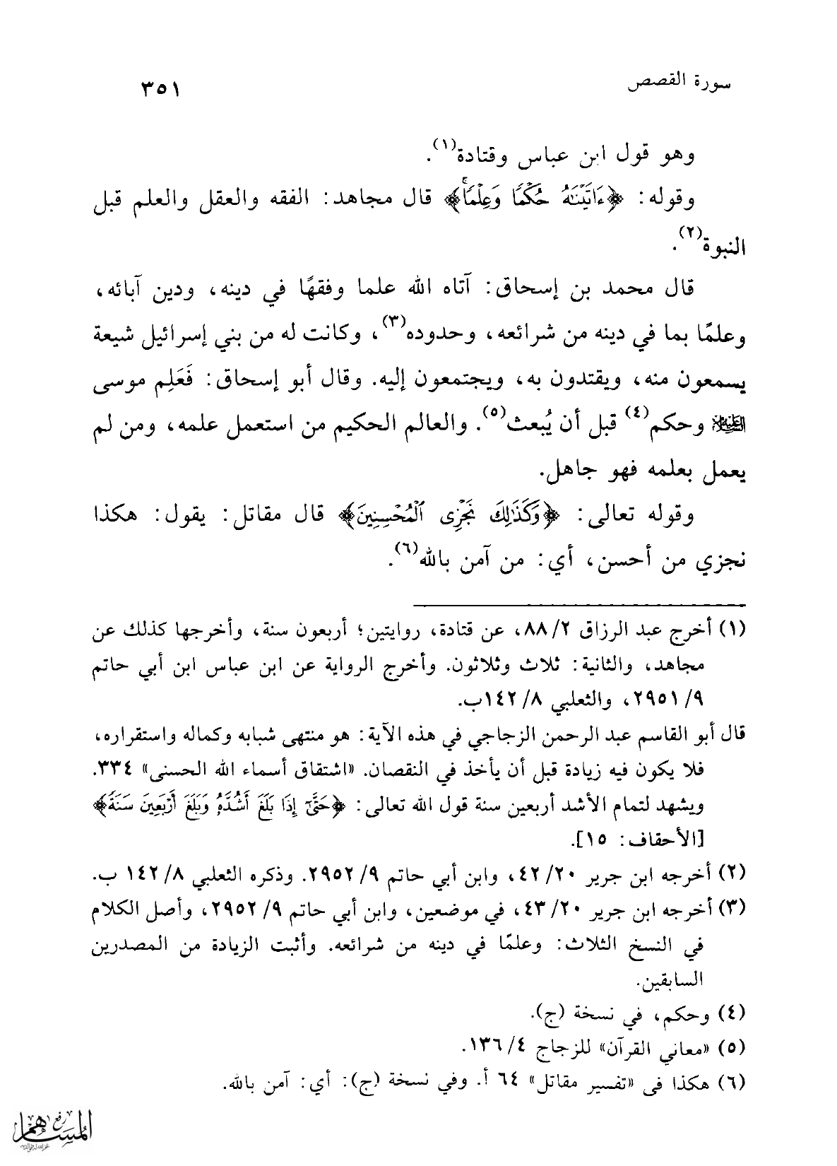 (¬3) أخرجه ابن جرير 20/ 43، في موضعين، وابن أبي حاتم 9/ 2952، وأصل الكلام في النسخ الثلاث: وعلمًا في دينه من شرائعه. وأثبت الزيادة من المصدرين السابقين.