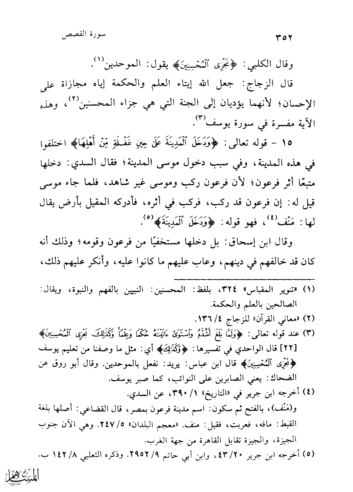 (¬1) "تنوير المقباس" 324، بلفظ: المحسنين: النبيين بالفهم والنبوة، ويقال: الصالحين بالعلم والحكمة.