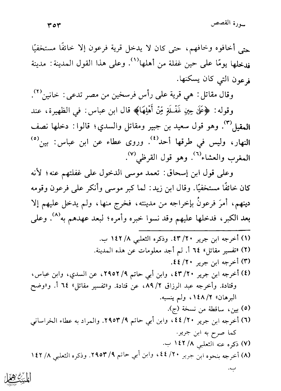 حتى أخافوه وخافهم، حتى كان لا يدخل قرية فرعون إلا خائفًا مستخفيًا فدخلها يومًا على حين غفلة من أهلها (¬1). وعلى هذا القول المدينة: مدينة فرعون التي كان يسكنها.