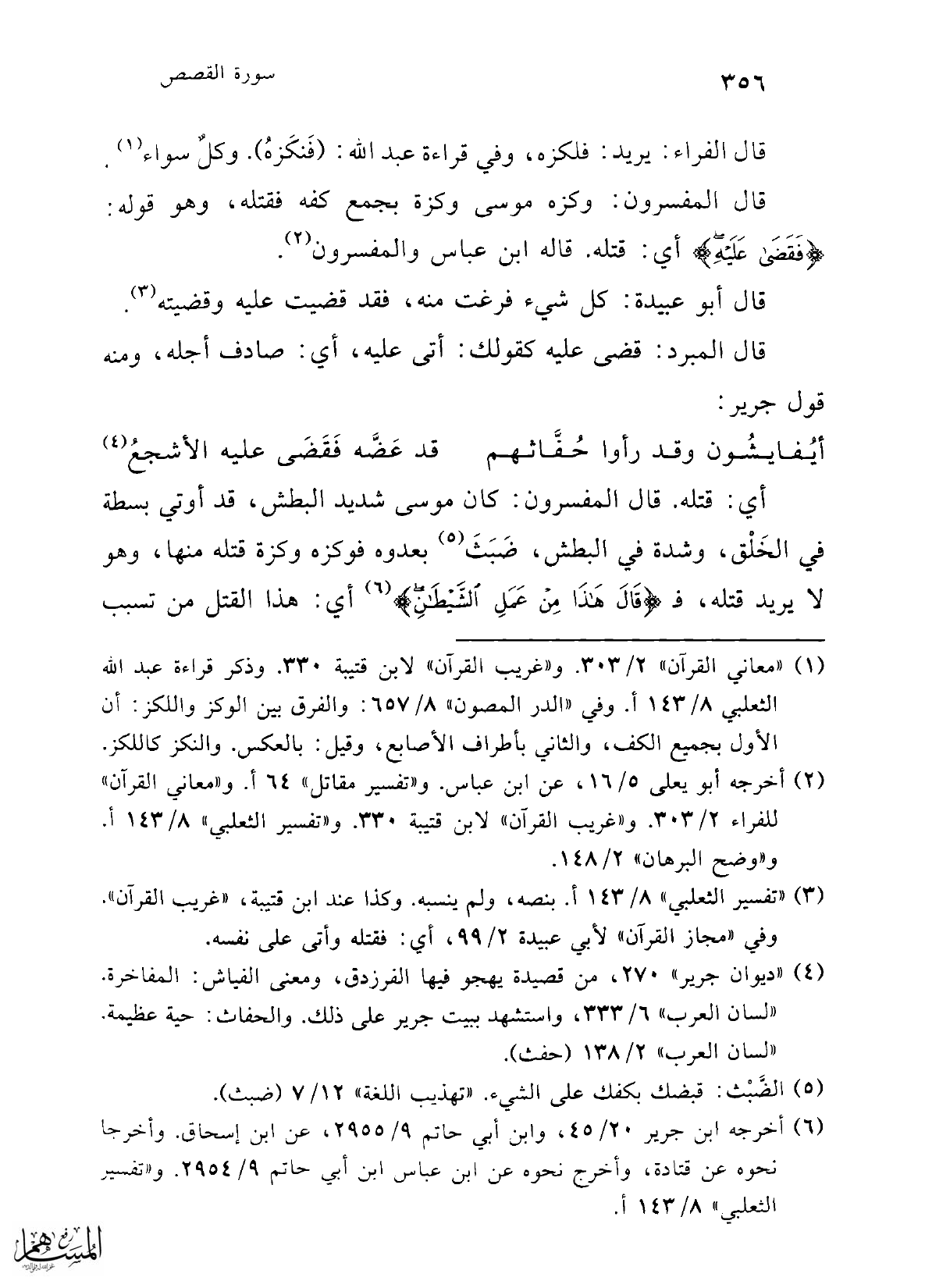 (¬3) "تفسير الثعلبي" 8/ 143 أ. بنصه، ولم ينسبه. وكذا عند ابن قتيبة، "غريب القرآن". وفي "مجاز القرآن" لأبي عبيدة 2/ 99، أي: فقتله وأتى على نفسه.