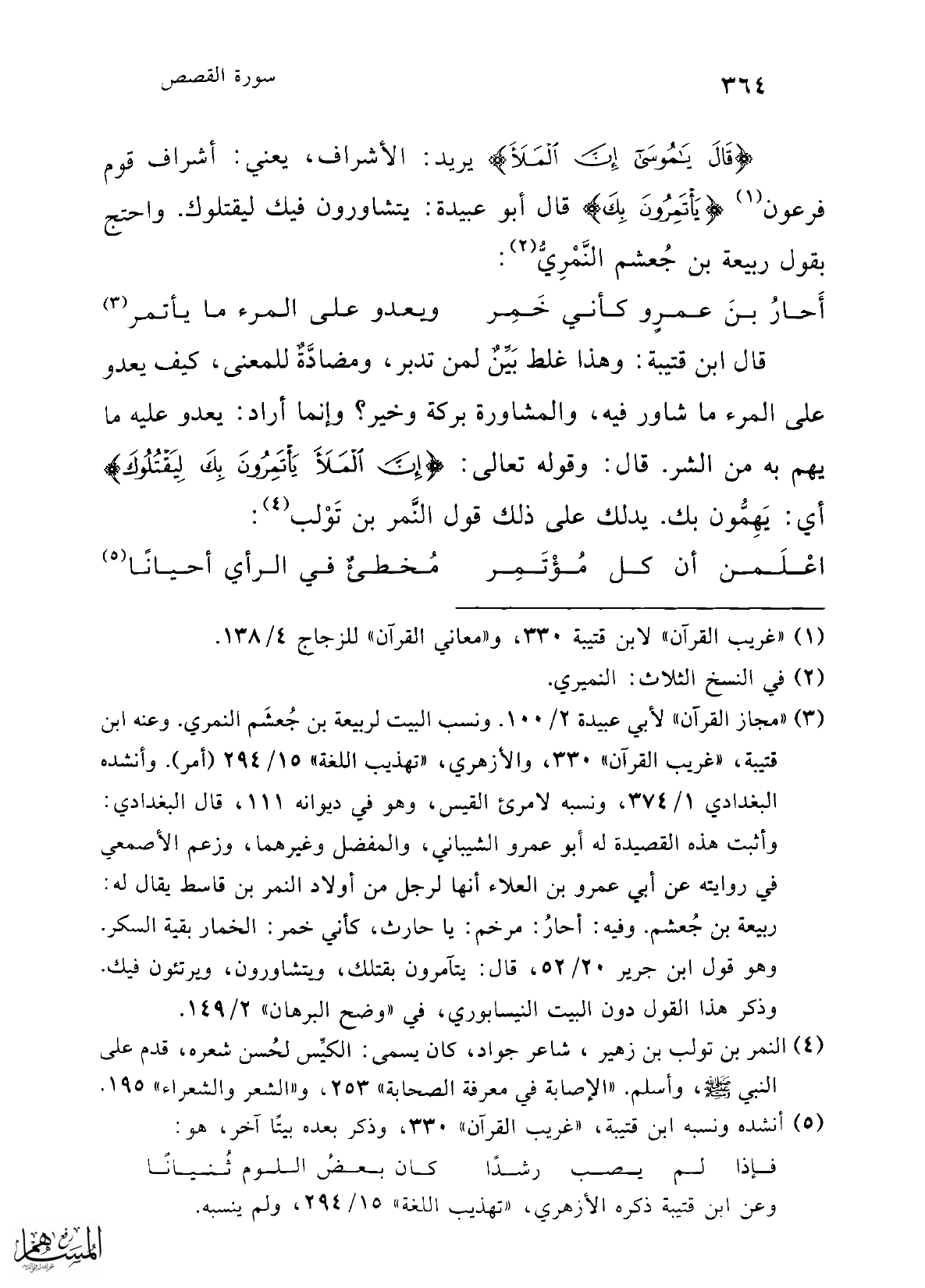 (¬3) "مجاز القرآن" لأبي عبيدة 2/ 100. ونسب البيت لربيعة بن جُعشَم النمري. وعنه ابن قتيبة، "غريب القرآن" 330، والأزهري، "تهذيب اللغة" 15/ 294 (أمر). وأنشده البغدادي 1/ 374، ونسبه لامرئ القيس، وهو في ديوانه 111، قال البغدادي: وأثبت هذه القصيدة له أبو عمرو الشيباني، والمفضل وغيرهما، وزعم الأصمعي في روايته عن أبي عمرو بن العلاء أنها لرجل من أولاد النمر بن قاسط يقال له: ربيعة بن جُعشم. وفيه: أحارُ: مرخم: يا حارث، كأني خمر: الخمار بقية السكر. وهو قول ابن جرير 20/ 52، قال: يتآمرون بقتلك، ويتشاورون، ويرتئون فيك. وذكر هذا القول دون البيت النيسابوري، في "وضح البرهان" 2/ 149.