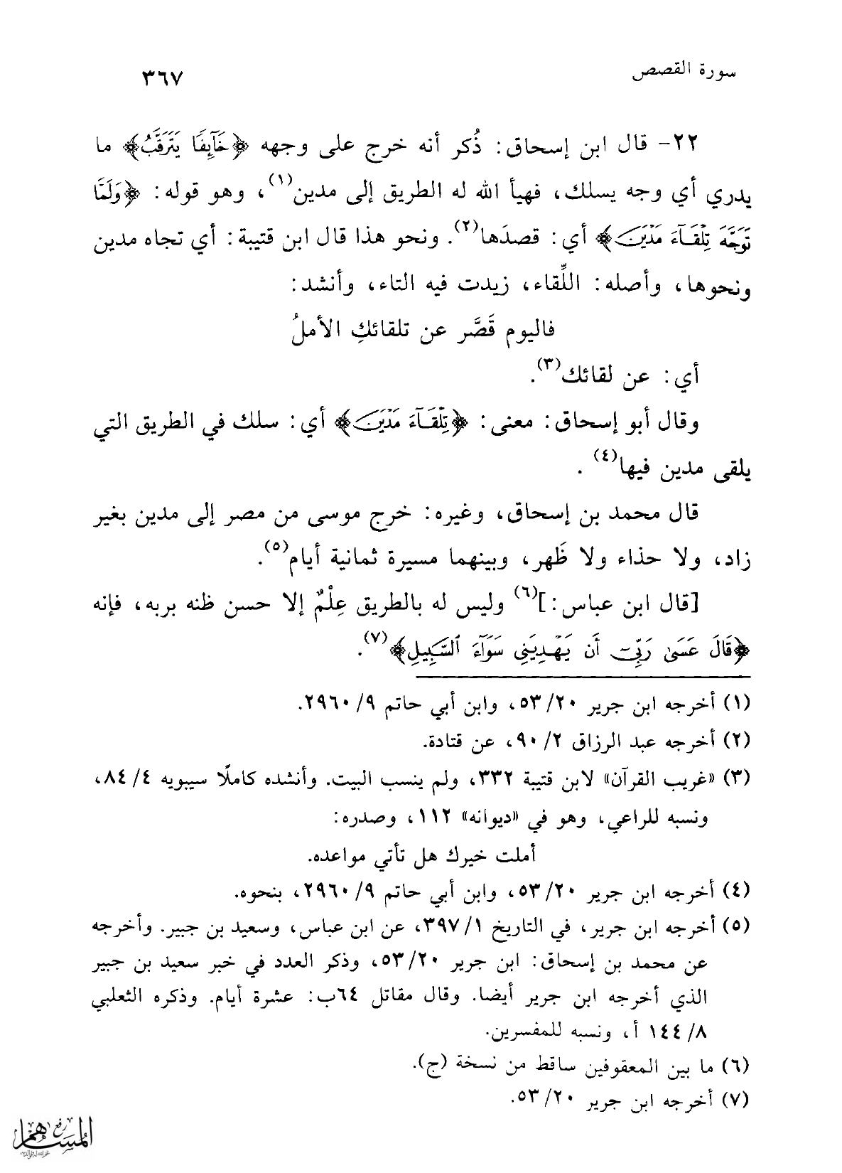 22 - قال ابن إسحاق: ذُكر أنه خرج على وجهه {خَائِفًا يَتَرَقَّبُ} ما يدري أي وجه يسلك، فهيأ الله له الطريق إلى مدين (¬1)، وهو قوله: {وَلَمَّا تَوَجَّهَ تِلْقَاءَ مَدْيَنَ} أي: قصدَها (¬2). ونحو هذا قال ابن قتيبة: أي تجاه مدين ونحوها، وأصله: اللِّقاء، زيدت فيه التاء، وأنشد: