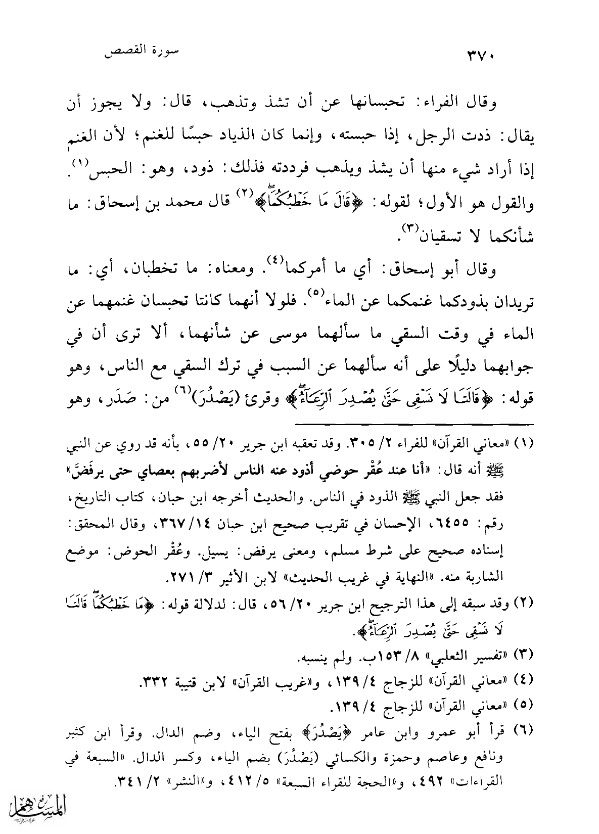 (¬1) "معاني القرآن" للفراء 2/ 305. وقد تعقبه ابن جرير 20/ 55، بأنه قد روي عن النبي -صلى الله عليه وسلم- أنه قال: "أنا عند عُقْر حوضي أذود عنه الناس لأضربهم بعصاي حتى يرفَضَّ" فقد جعل النبي -صلى الله عليه وسلم- الذود في الناس. والحديث أخرجه ابن حبان، كتاب التاريخ، رقم: 6455، الإحسان في تقريب صحيح ابن حبان 14/ 367، وقال المحقق: إسناده صحيح على شرط مسلم، ومعنى يرفض: يسيل. وعُقْر الحوض: موضع الشاربة منه "النهاية في غريب الحديث" لابن الأثير 3/ 271.