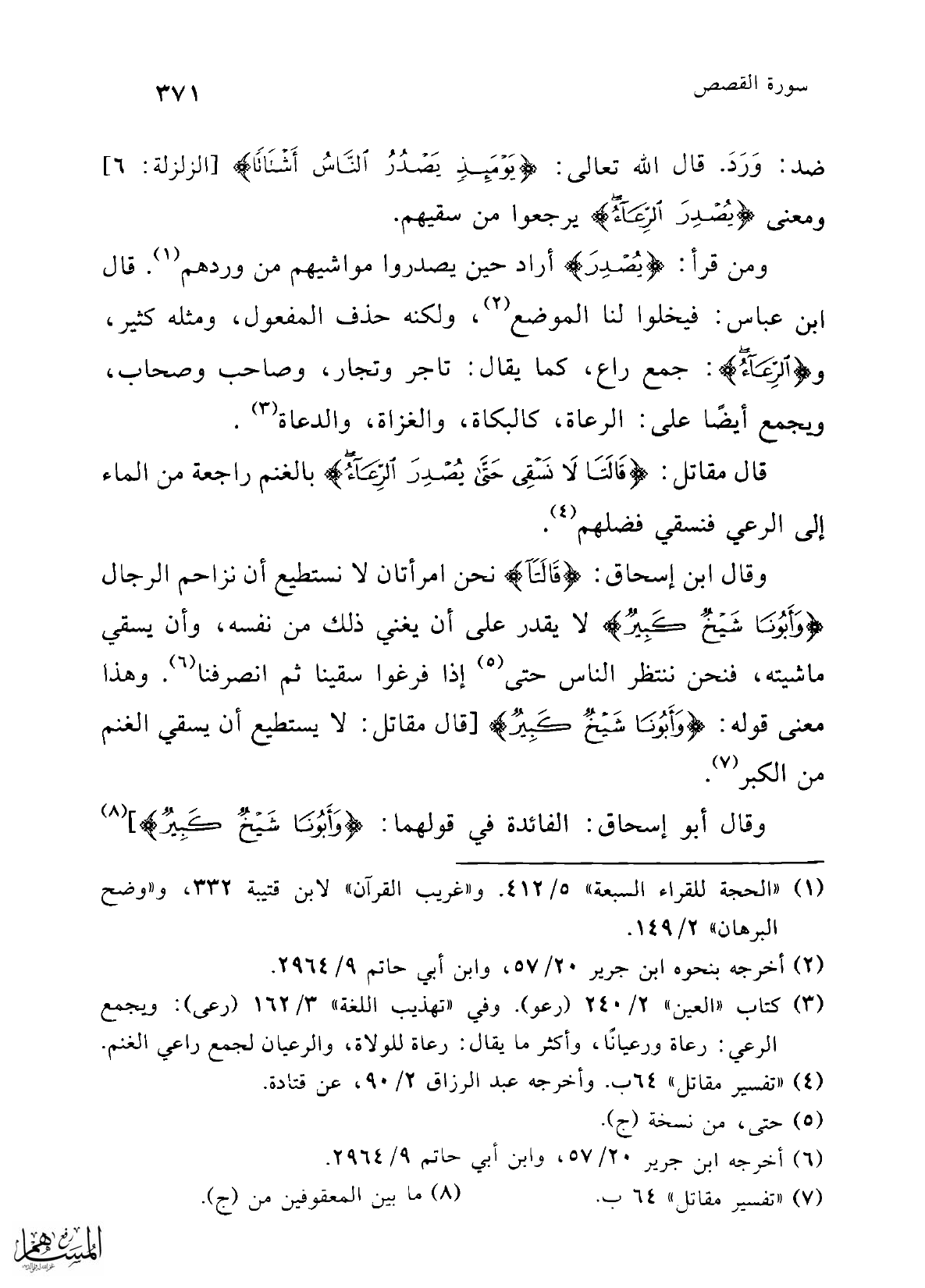 ومن قرأ: {يُصْدِرَ} أراد حين يصدروا مواشيهم من وردهم (¬1). قال ابن عباس: فيخلوا لنا الموضع (¬2)، ولكنه حذف المفعول، ومثله كثير، و {الرِّعَاءُ}: جمع راع، كما يقال: تاجر وتجار، وصاحب وصحاب، ويجمع أيضًا على: الرعاة، كالبكاة، والغزاة، والدعاة (¬3).