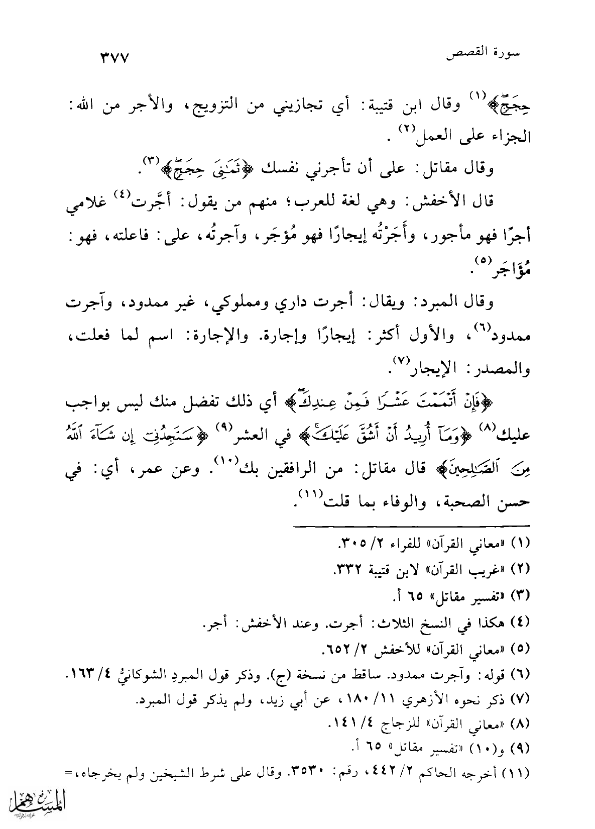 {فَإِنْ أَتْمَمْتَ عَشْرًا فَمِنْ عِنْدِكَ} أي ذلك تفضل منك ليس بواجب عليك (8) {وَمَا أُرِيدُ أَنْ أَشُقَّ عَلَيْكَ} في العشر (9) {سَتَجِدُنِي إِنْ شَاءَ اللَّهُ مِنَ الصَّالِحِينَ} قال مقاتل: من الرافقين بك (10). وعن عمر، أي: في حسن الصحبة، والوفاء بما قلت (11).