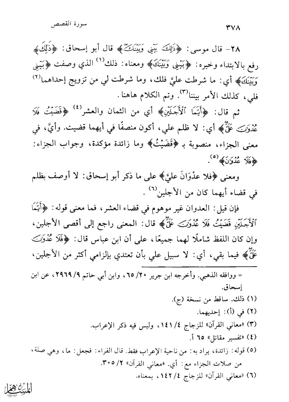 28 - قال موسى: {ذَلِكَ بَيْنِي وَبَيْنَكَ} قال أبو إسحاق: {ذَلِكَ} رفع بالابتداء وخبره: {بَيْنِي وَبَيْنَكَ} ومعناه: ذلك (¬1) الذي وصفت {بَيْنِي وَبَيْنَكَ} أي: ما شرطت عليَّ فلك، وما شرطت لي من تزويج إحداهما (¬2) فلي، كذلك الأمر بيننا (¬3). وتم الكلام هاهنا.