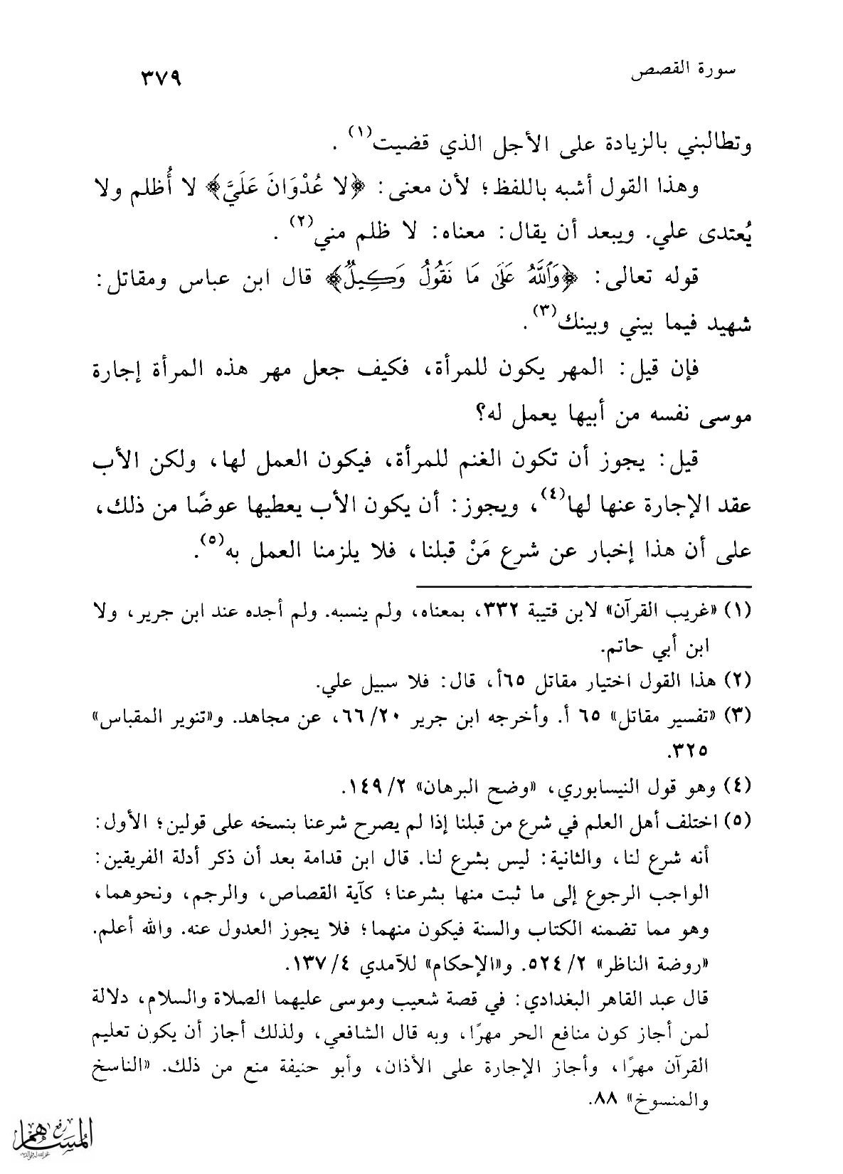 قال عبد القاهر البغدادي: في قصة شعيب وموسى عليهما الصلاة والسلام، دلالة لمن أجاز كون منافع الحر مهرًا، وبه قال الشافعي، ولذلك أجاز أن يكون تعليم القرآن مهرًا، وأجاز الإجارة على الأذان، وأبو حنيفة منع من ذلك. "الناسخ والمنسوخ" 88.
