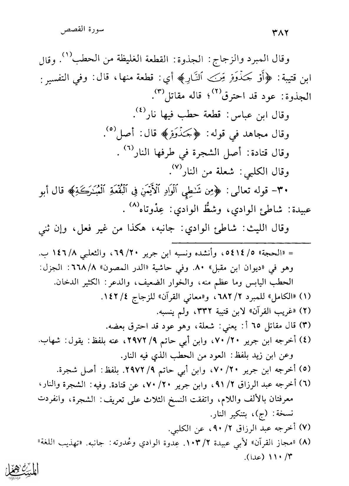 30 - قوله تعالى: {مِنْ شَاطِئِ الْوَادِ الْأَيْمَنِ فِي الْبُقْعَةِ الْمُبَارَكَةِ} قال أبو عبيدة: شاطئ الوادي، وشطُّ الوادي: عِدْوتاه (¬8).