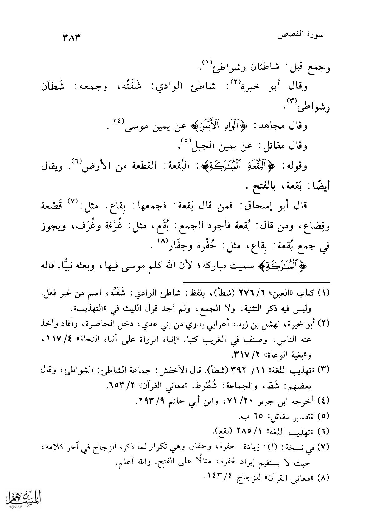 وقوله: {الْبُقْعَةِ الْمُبَارَكَةِ}: البُقعة: القطعة من الأرض (¬6). ويقال أيضًا: بَقعة، بالفتح.