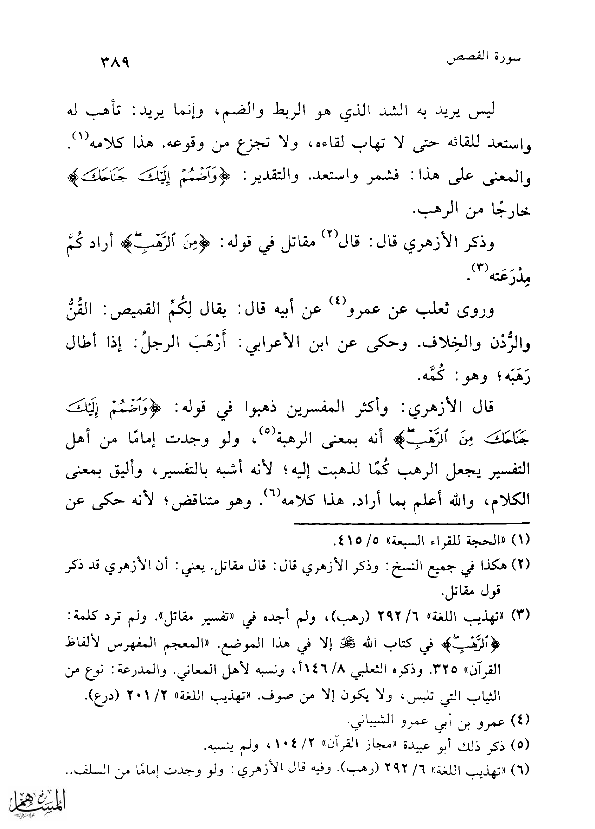 قال الأزهري: وأكثر المفسرين ذهبوا في قوله: {وَاضْمُمْ إِلَيْكَ جَنَاحَكَ مِنَ الرَّهْبِ} أنه بمعنى الرهبة (¬5)، ولو وجدت إمامًا من أهل التفسير يجعل الرهب كُمًا لذهبت إليه؛ لأنه أشبه بالتفسير، وأليق بمعنى الكلام، والله أعلم بما أراد. هذا كلامه (¬6). وهو متناقض؛ لأنه حكى عن