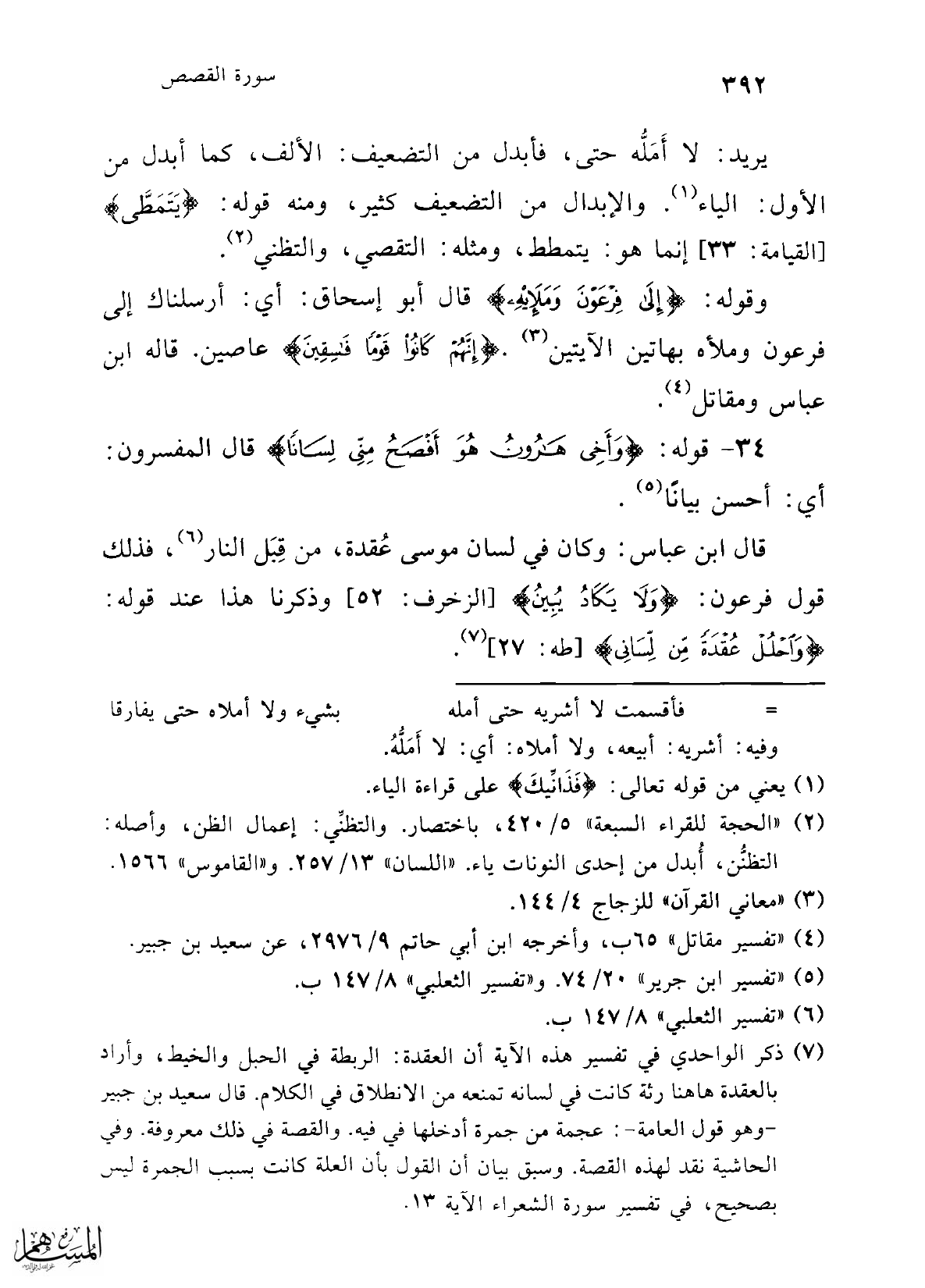 (¬7) ذكر الواحدي في تفسير هذه الآية أن العقدة: الربطة في الحبل والخيط، وأراد بالعقدة هاهنا رثة كانت في لسانه تمنعه من الانطلاق في الكلام. قال سعيد بن جبير -وهو قول العامة-: عجمة من جمرة أدخلها في فيه. والقصة في ذلك معروفة. وفي الحاشية نقد لهذه القصة. وسبق بيان أن القول بأن العلة كانت بسبب الجمرة ليس بصحيح، في تفسير سورة الشعراء الآية 13.