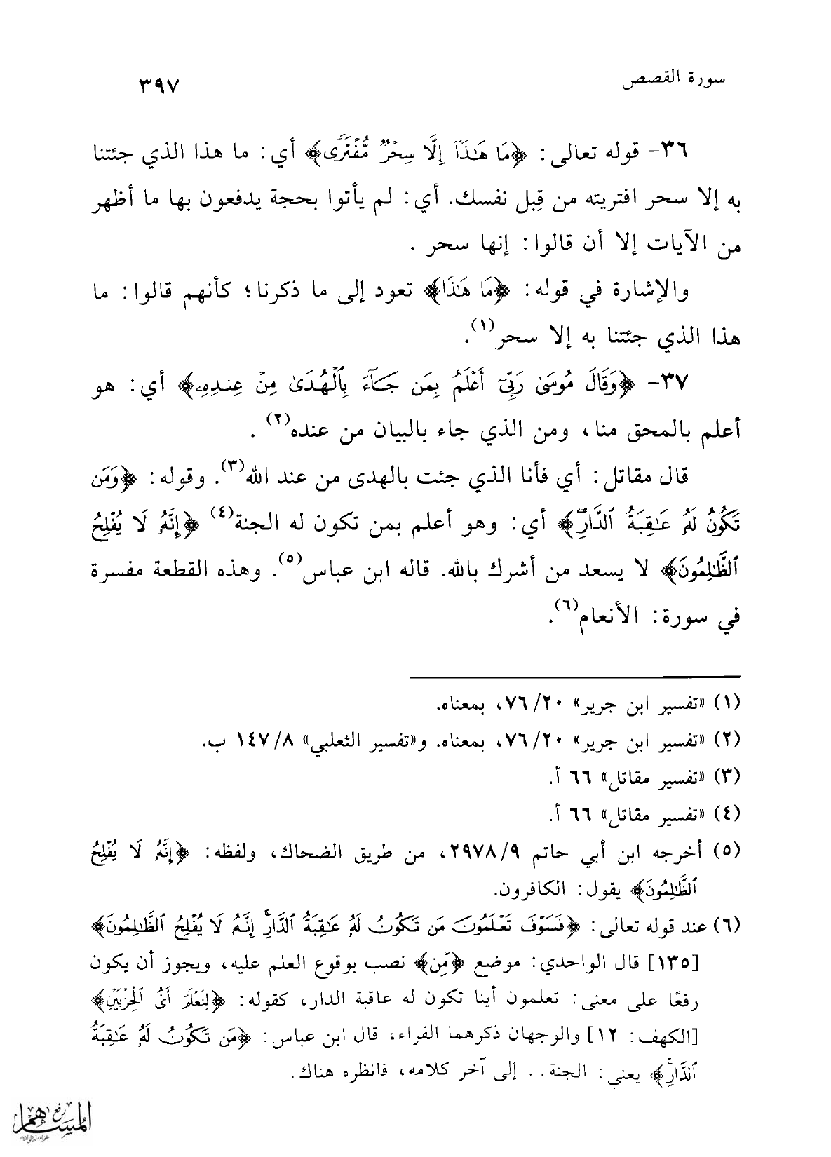 (¬6) عند قوله تعالى: {فَسَوْفَ تَعْلَمُونَ مَنْ تَكُونُ لَهُ عَاقِبَةُ الدَّارِ إِنَّهُ لَا يُفْلِحُ الظَّالِمُونَ} [135] قال الواحدي: موضع {مِن} نصب بوقوع العلم عليه، ويجوز أن يكون رفعًا على معنى: تعلمون أينا تكون له عاقبة الدار، كقوله: {لِنَعْلَمَ أَيُّ الْحِزْبَيْنِ} [الكهف: 12] والوجهان ذكرهما الفراء، قال ابن عباس: {مَنْ تَكُونُ لَهُ عَاقِبَةُ الدَّارِ} يعنىِ: الجنة .. إلى آخر كلامه، فانظره هناك.