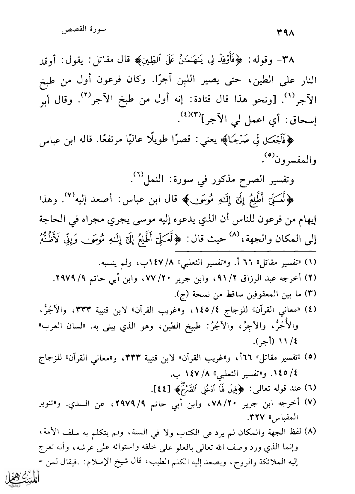 38 - وقوله: {فَأَوْقِدْ لِي يَا هَامَانُ عَلَى الطِّينِ} قال مقاتل: يقول: أوقد النار على الطين، حتى يصير اللبِن آجرًا. وكان فرعون أول من طبخ الآجر (¬1). [ونحو هذا قال قتادة: إنه أول من طبخ الآجر (¬2). وقال أبو إسحاق: أي اعمل لي الآجر] (¬3) (¬4).
