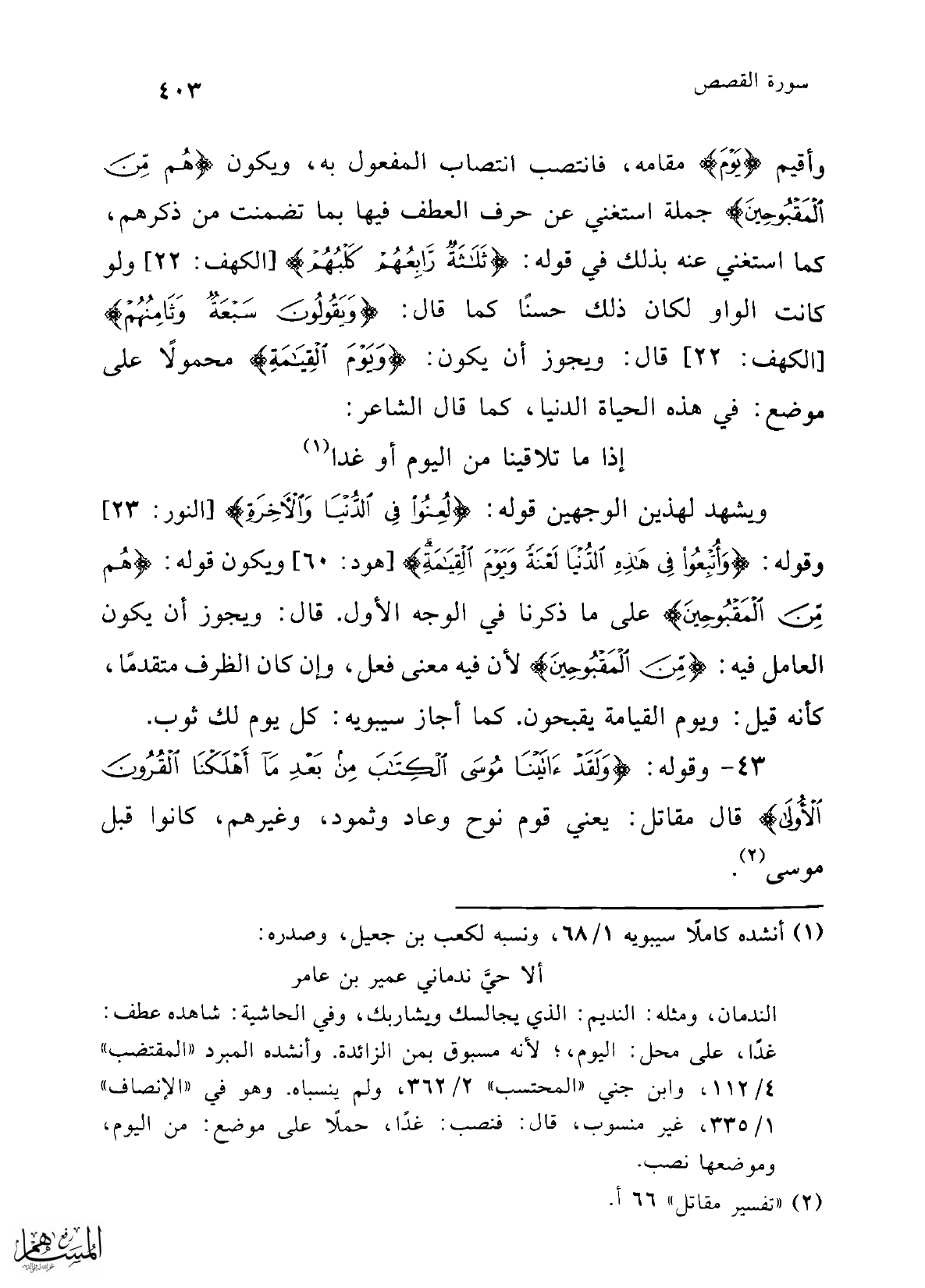 وأقيم {يَوْمَ} مقامه، فانتصب انتصاب المفعول به، ويكون {هُمْ مِنَ الْمَقْبُوحِينَ} جملة استغني عن حرف العطف فيها بما تضمنت من ذكرهم، كما استغني عنه بذلك في قوله: {ثَلَاثَةٌ رَابِعُهُمْ كَلْبُهُمْ} [الكهف: 22] ولو كانت الواو لكان ذلك حسنًا كما قال: {وَيَقُولُونَ سَبْعَةٌ وَثَامِنُهُمْ} [الكهف: 22] قال: ويجوز أن يكون: {وَيَوْمَ الْقِيَامَةِ} محمولَّا عَلى موضع: في هذه الحياة الدنيا، كما قال الشاعر: