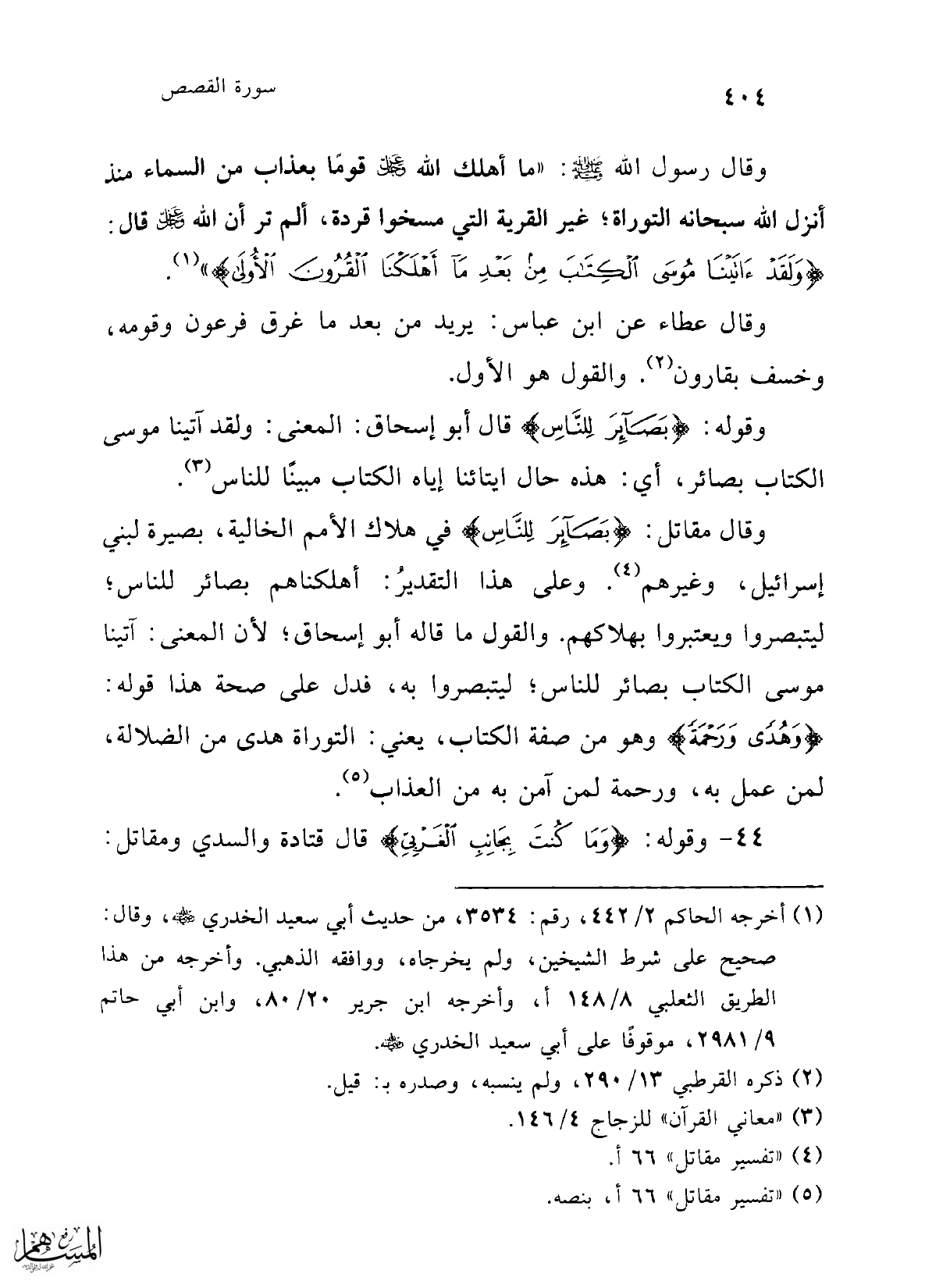 وقال رسول الله -صلى الله عليه وسلم-: "ما أهلك الله -عز وجل- قومًا بعذاب من السماء منذ أنزل الله سبحانه التوراة؛ غير القرية التي مسخوا قردة، ألم تر أن الله -عز وجل- قال: {وَلَقَدْ آتَيْنَا مُوسَى الْكِتَابَ مِنْ بَعْدِ مَا أَهْلَكْنَا الْقُرُونَ الْأُولَى} " (¬1).