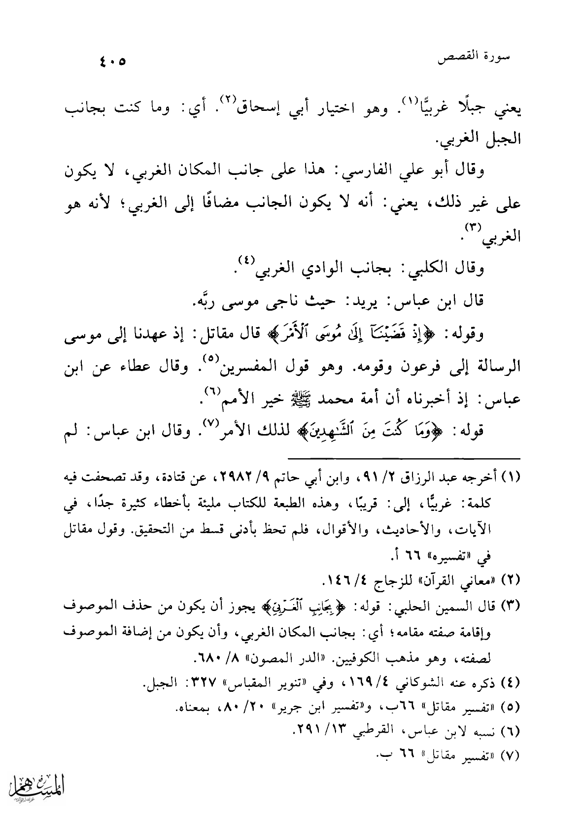 (¬3) قال السمين الحلبي: قوله: {بِجَانِبِ الْغَرْبِيِّ} يجوز أن يكون من حذف الموصوف وإقامة صفته مقامه؛ أي: بجانب المكان الغربي، وأن يكون من إضافة الموصوف لصفته، وهو مذهب الكوفيين. "الدر المصون" 8/ 680.