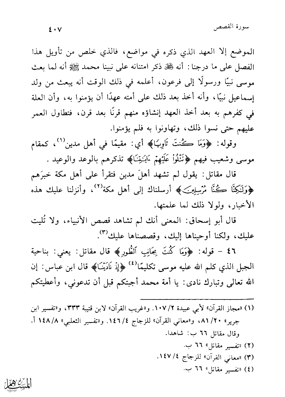 46 - قوله: {وَمَا كُنْتَ بِجَانِبِ الطُّورِ} قال مقاتل: يعني: بناحية الجبل الذي كلم الله عليه موسى تكليمًا (¬4) {إِذْ نَادَيْنَا} قال ابن عباس: إن الله تعالى وتبارك نادى: يا أمة محمد أجبتكم قبل أن تدعوني، وأعطيتكم