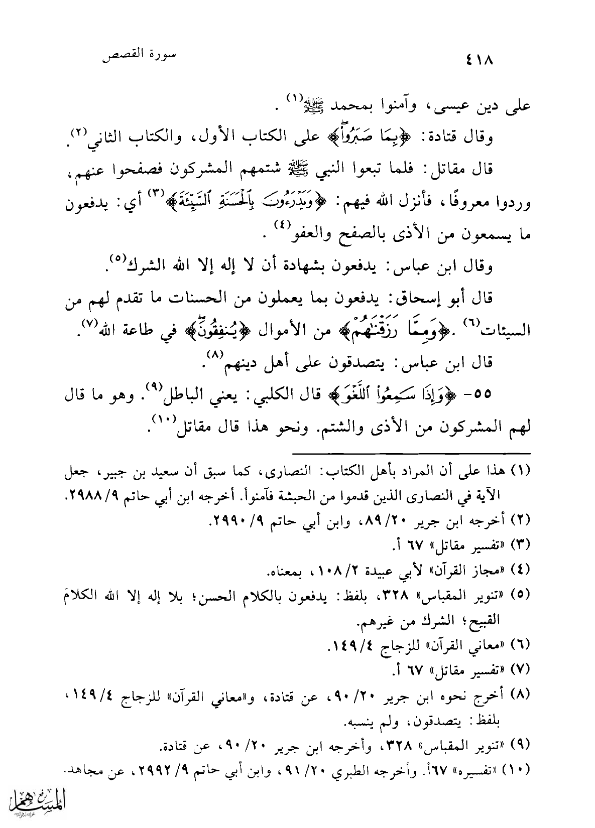 (¬5) "تنوير المقباس" 328، بلفظ: يدفعون بالكلام الحسن؛ بلا إله إلا الله الكلامَ القبيح؛ الشرك من غيرهم.