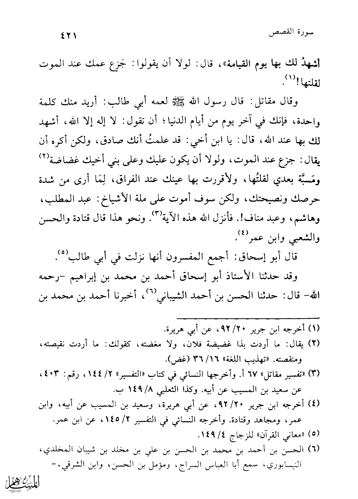 (¬3) "تفسير مقاتل" 67 أ. وأخرجها النسائي في كتاب "التفسير" 2/ 144، رقم: 403، عن سعيد بن المسيب عن أبيه. وكذا الثعلبي 8/ 149 ب.