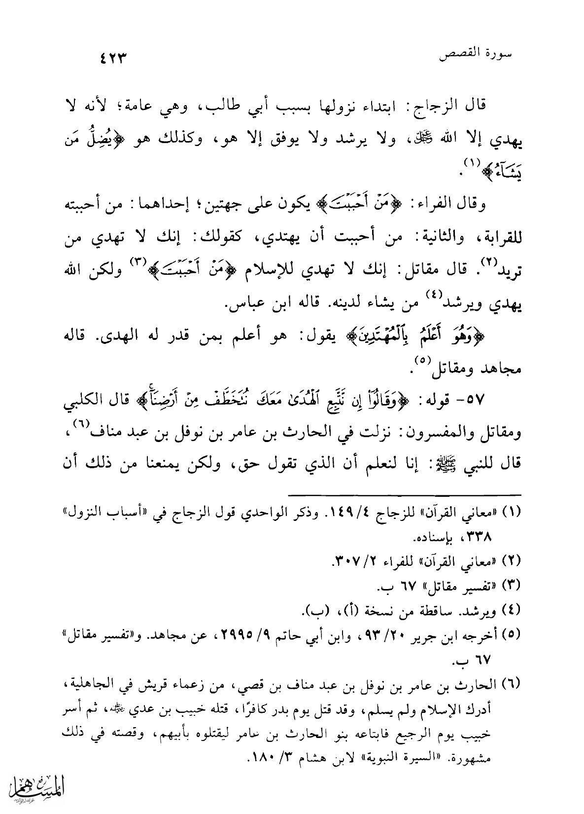 وقال الفراء: {مَنْ أَحْبَبْتَ} يكون على جهتين؛ إحداهما: من أحببته للقرابة، والثانية: من أحببت أن يهتدي، كقولك: إنك لا تهدي من تريد (¬2). قال مقاتل: إنك لا تهدي للإسلام {مَنْ أَحْبَبْتَ} (¬3) ولكن الله يهدي ويرشد (¬4) من يشاء لدينه. قاله ابن عباس.