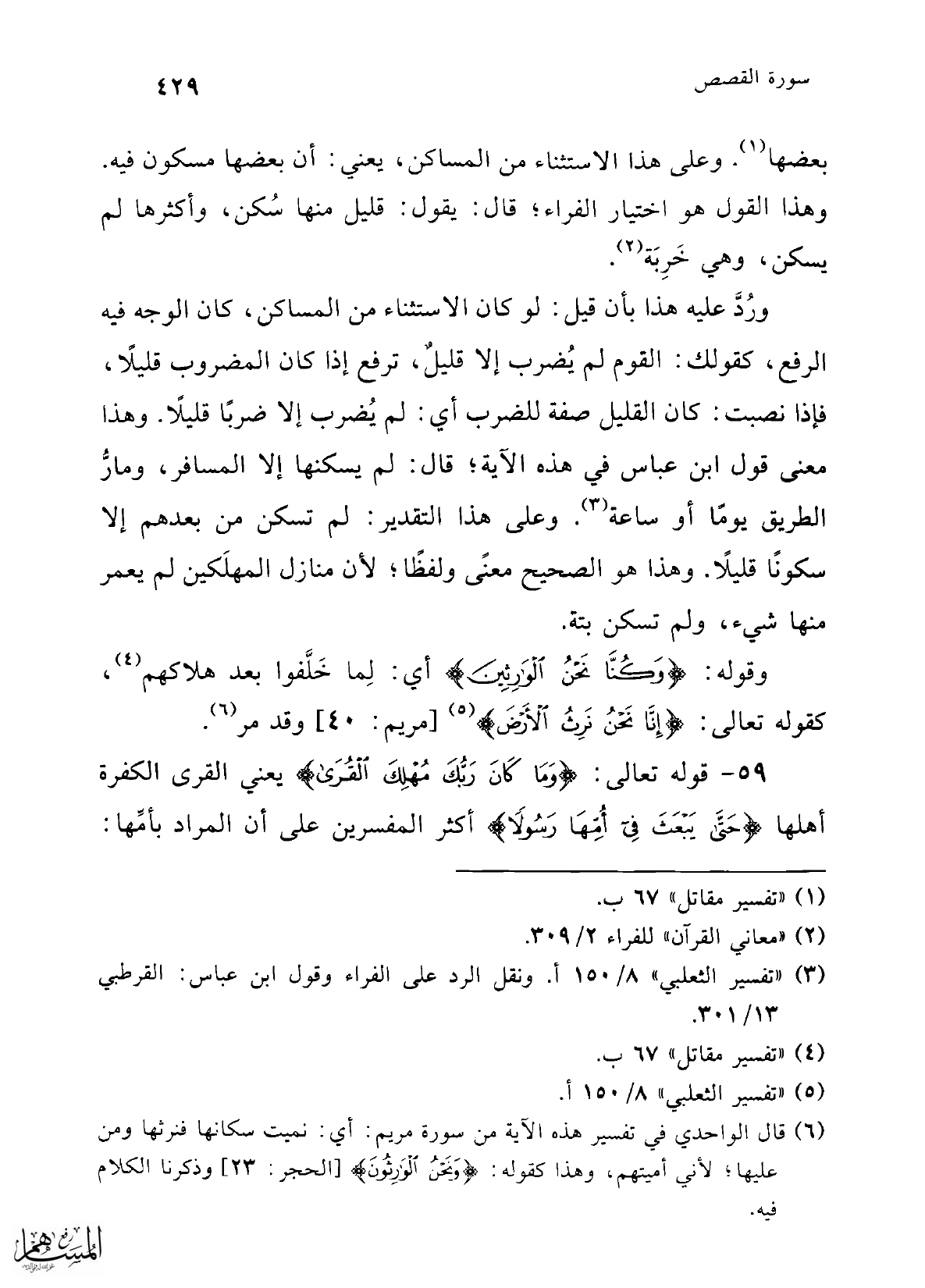 ورُدَّ عليه هذا بأن قيل: لو كان الاستثناء من المساكن، كان الوجه فيه الرفع، كقولك: القوم لم يُضرب إلا قليلٌ، ترفع إذا كان المضروب قليلاً، فإذا نصبت: كان القليل صفة للضرب أي: لم يُضرب إلا ضربًا قليلاً. وهذا معنى قول ابن عباس في هذه الآية؛ قال: لم يسكنها إلا المسافر، ومارُّ الطريق يومًا أو ساعة (¬3). وعلى هذا التقدير: لم تسكن من بعدهم إلا سكونًا قليلاً. وهذا هو الصحيح معنًى ولفظًا؛ لأن منازل المهلَكين لم يعمر منها شيء، ولم تسكن بتة.