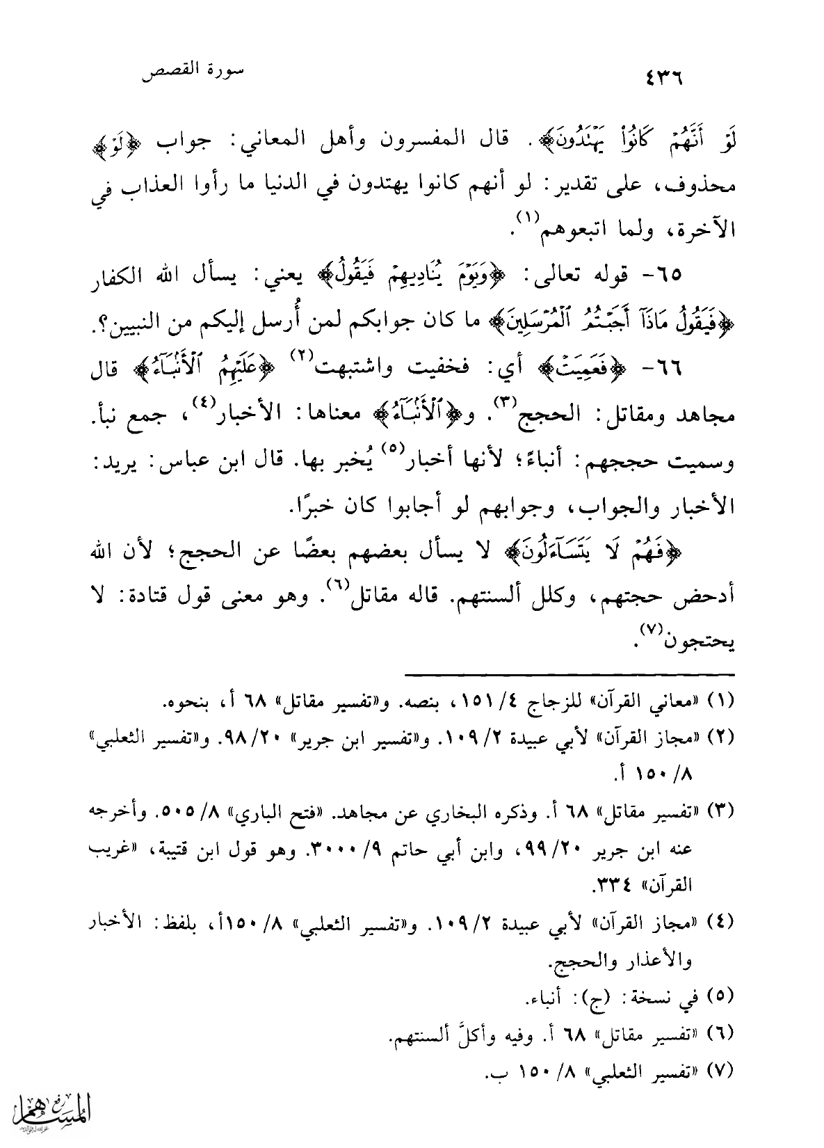 66 - {فَعَمِيَتْ} أي: فخفيت واشتبهت (¬2) {عَلَيْهِمُ الْأَنْبَاءُ} قال مجاهد ومقاتل: الحجج (¬3). و {الْأَنْبَاءُ} معناها: الأخبار (¬4)، جمع نبأ. وسميت حججهم: أنباءً؛ لأنها أخبار (¬5) يُخبر بها. قال ابن عباس: يريد: الأخبار والجواب، وجوابهم لو أجابوا كان خبرًا.