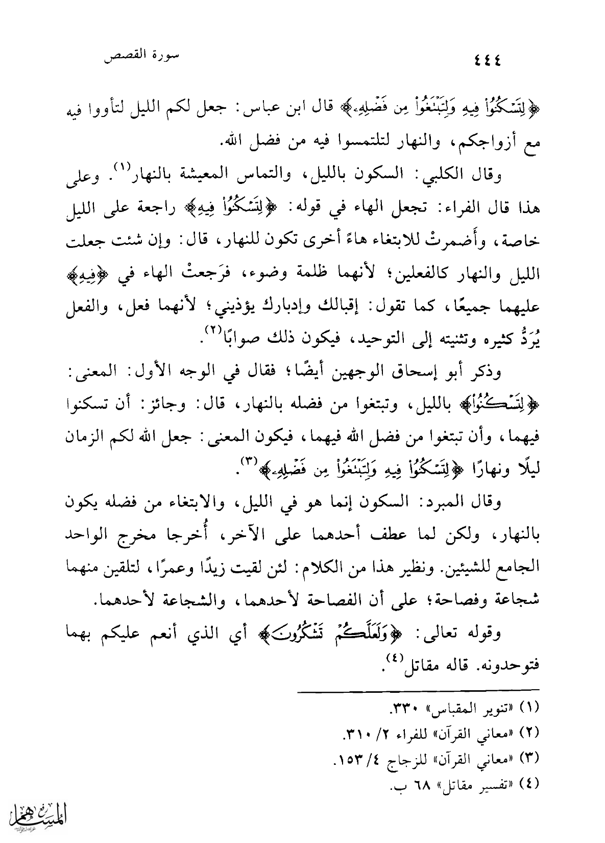 وقال المبرد: السكون إنما هو في الليل، والابتغاء من فضله يكون بالنهار، ولكن لما عطف أحدهما على الآخر، أُخرجا مخرج الواحد الجامع للشيئين. ونظير هذا من الكلام: لئن لقيت زيدًا وعمرًا، لتلقين منهما شجاعة وفصاحة؛ على أن الفصاحة لأحدهما، والشجاعة لأحدهما.