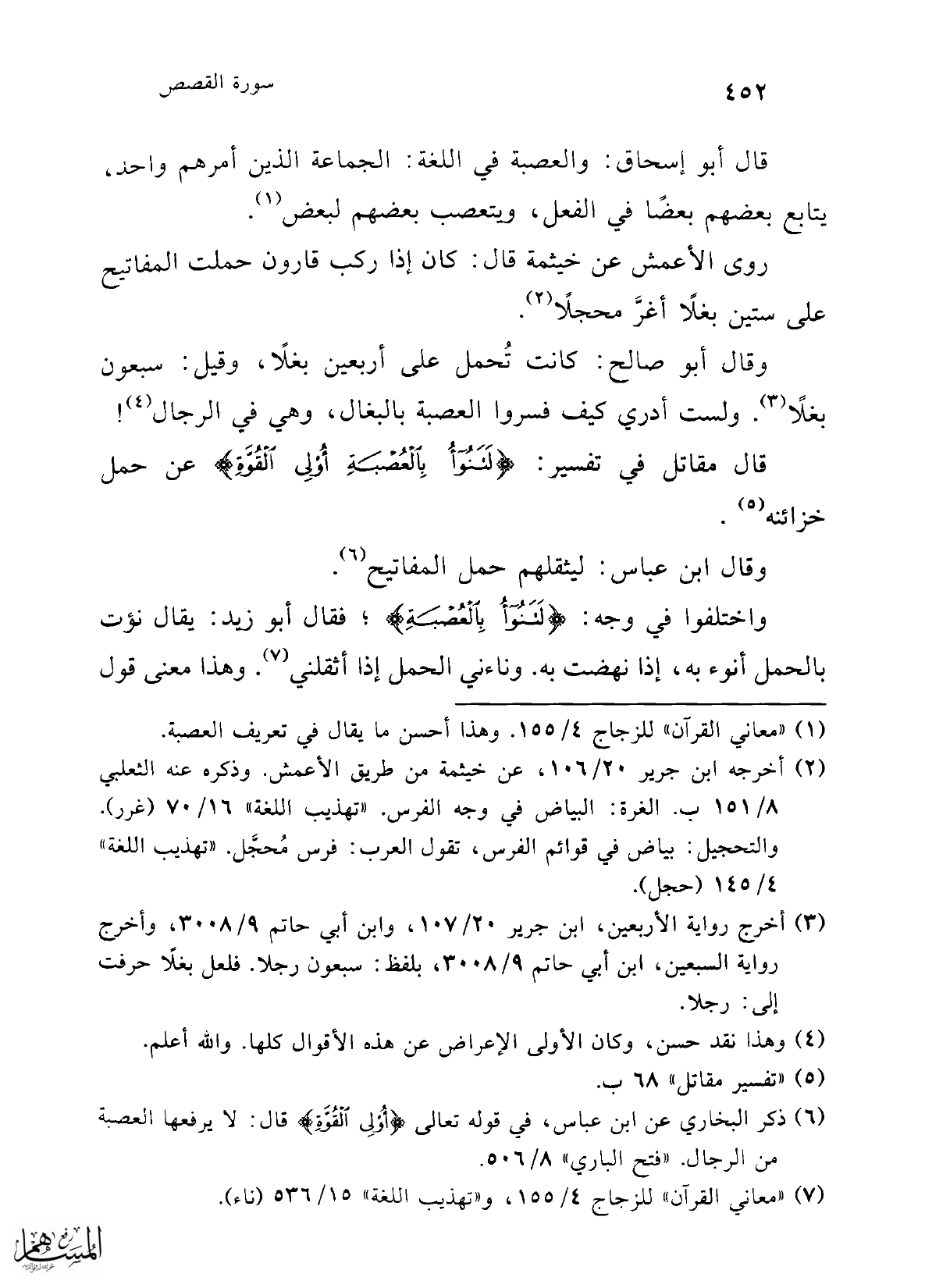 قال مقاتل في تفسير: {لَتَنُوءُ بِالْعُصْبَةِ أُولِي الْقُوَّةِ} عن حمل خزائنه (¬5).