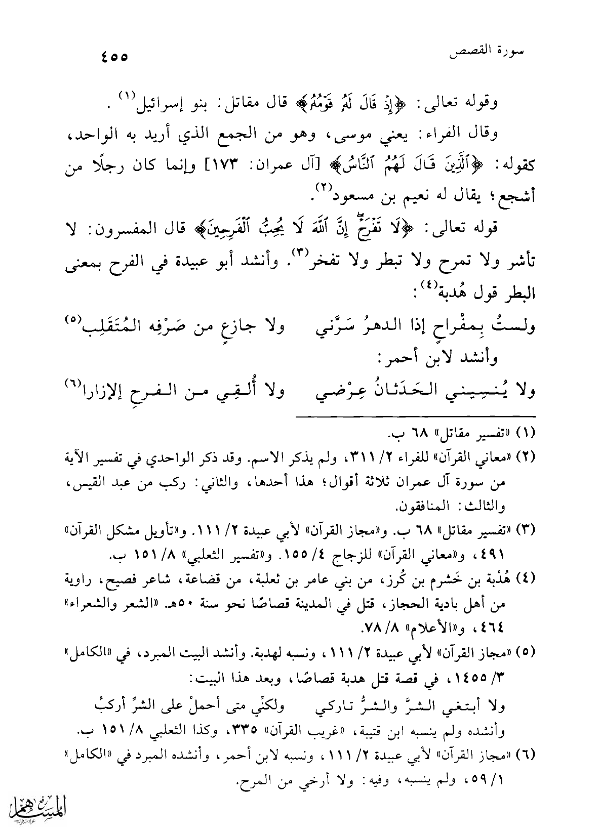 (¬3) "تفسير مقاتل" 68 ب. و"مجاز القرآن" لأبي عبيدة 2/ 111. و"تأويل مشكل القرآن " 491، و"معاني القرآن" للزجاج 4/ 155. و"تفسير الثعلبي" 8/ 151 ب.