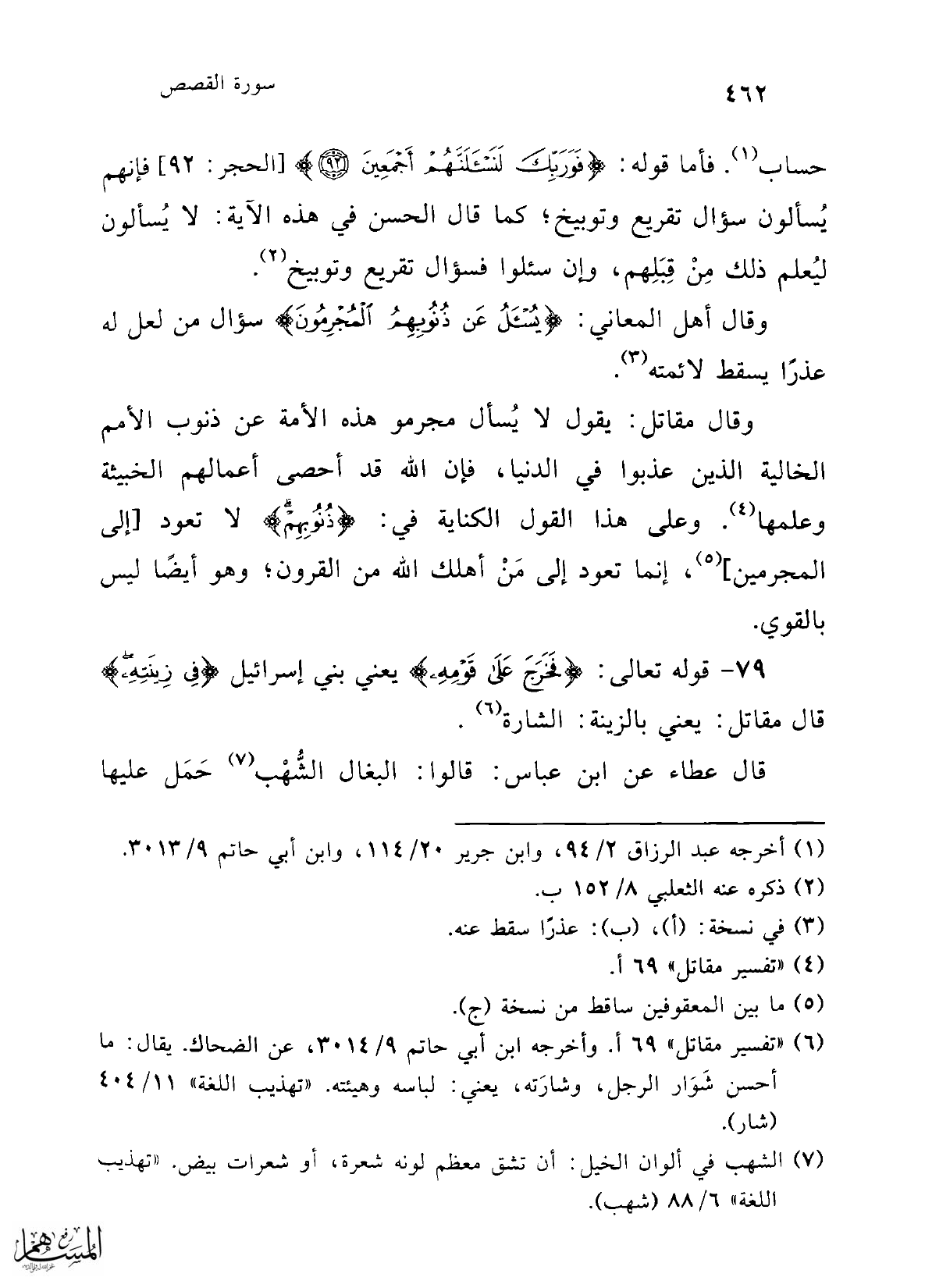 وقال مقاتل: يقول لا يُسأل مجرمو هذه الأمة عن ذنوب الأمم الخالية الذين عذبوا في الدنيا، فإن الله قد أحصى أعمالهم الخبيثة وعلمها (¬4). وعلى هذا القول الكناية في: {ذُنُوبِهِمُ} لا تعود [إلى المجرمين] (¬5)، إنما تعود إلى مَنْ أهلك الله من القرون؛ وهو أيضًا ليس بالقوي.