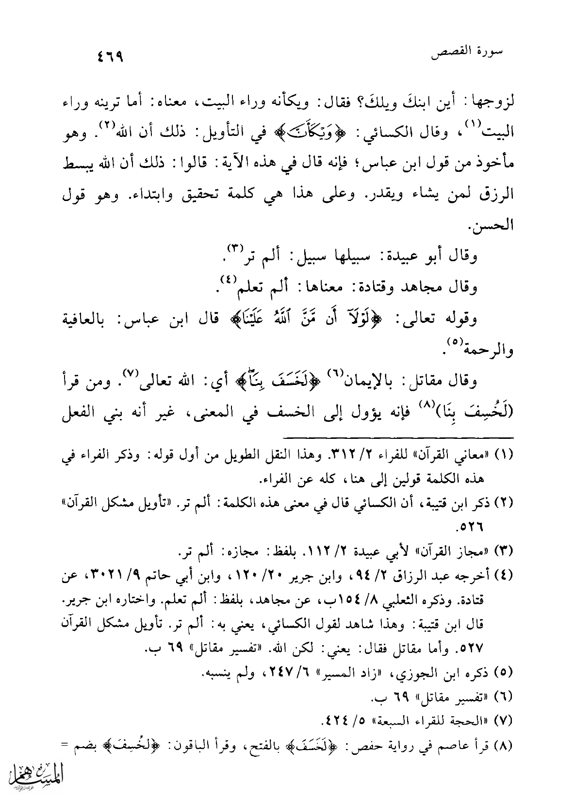 (¬8) قرأ عاصم في رواية حفص: {لَخَسَفَ} بالفتح، وقرأ الباقون: {لخُسِفَ} بضم =