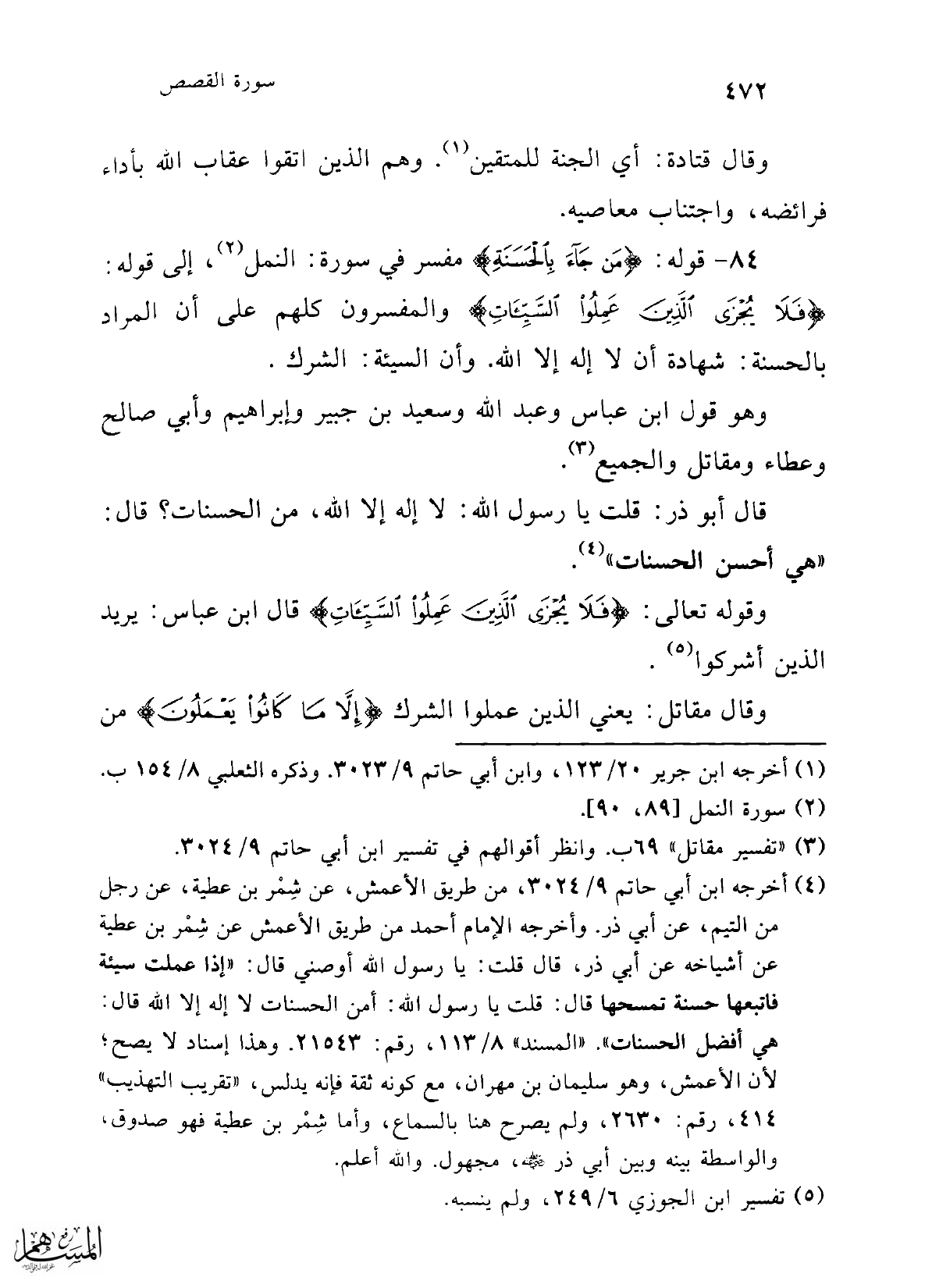 84 - قوله: {مَنْ جَاءَ بِالْحَسَنَةِ} مفسر في سورة: النمل (¬2)، إلى قوله: {فَلَا يُجْزَى الَّذِينَ عَمِلُوا السَّيِّئَاتِ} والمفسرون كلهم على أن المراد بالحسنة: شهادة أن لا إله إلا الله. وأن السيئة: الشرك.