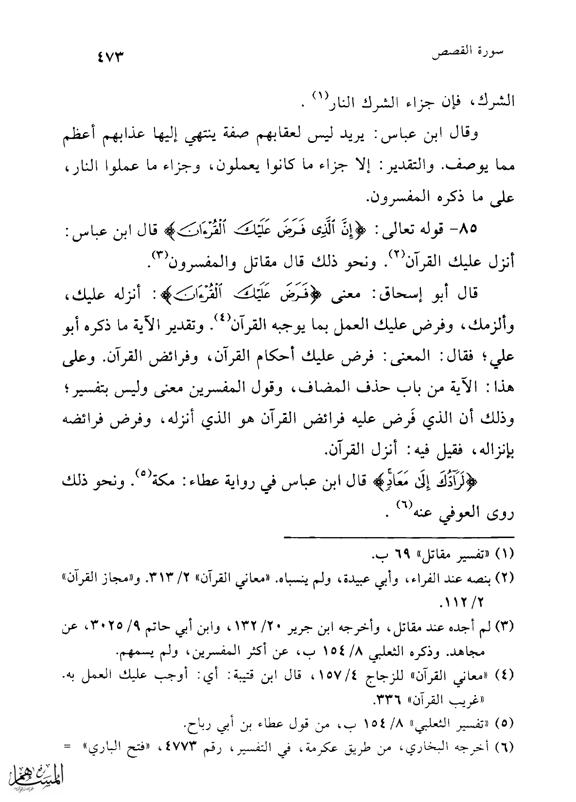 85 - قوله تعالى: {إِنَّ الَّذِي فَرَضَ عَلَيْكَ الْقُرْآنَ} قال ابن عباس: أنزل عليك القرآن (¬2). ونحو ذلك قال مقاتل والمفسرون (¬3).